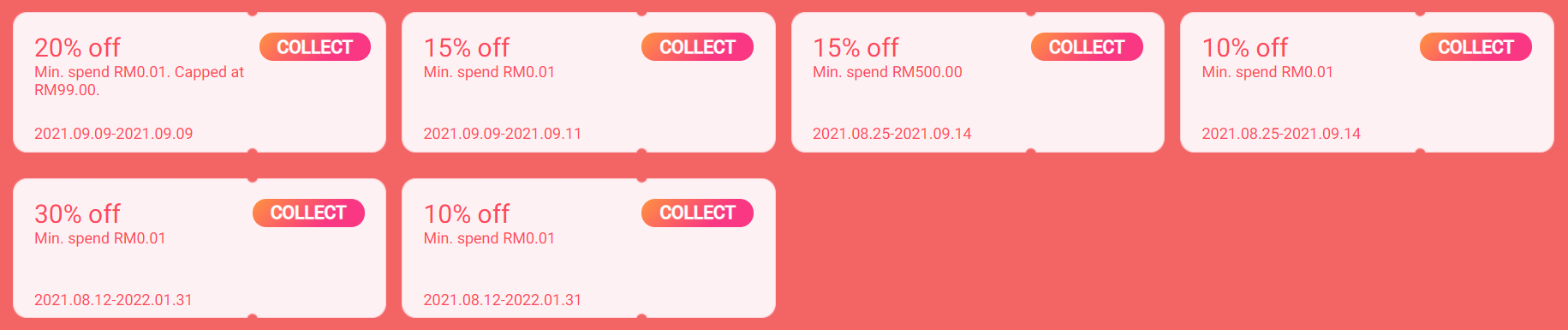 - 消费RM0.01,可折扣20%,高达RM99折扣(仅限至9月9日)