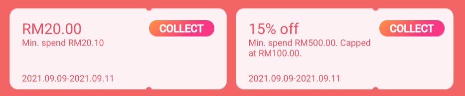 - 消费RM500,可折扣RM100(仅限9月9日至9月11日)