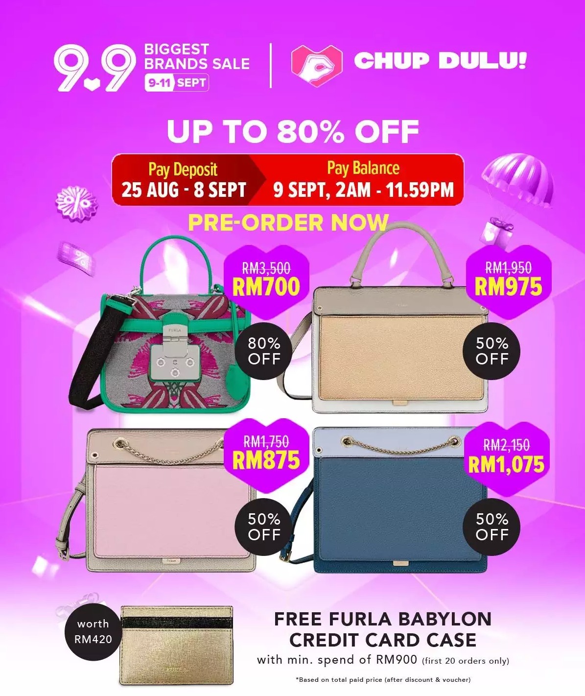 Furla 意大利高端轻奢品牌包包在【9.9】这天推出折扣高达80%!另外首20位顾客消费RM900 可免费获得Furla Babylon Credit Card Case(价值RM420)!