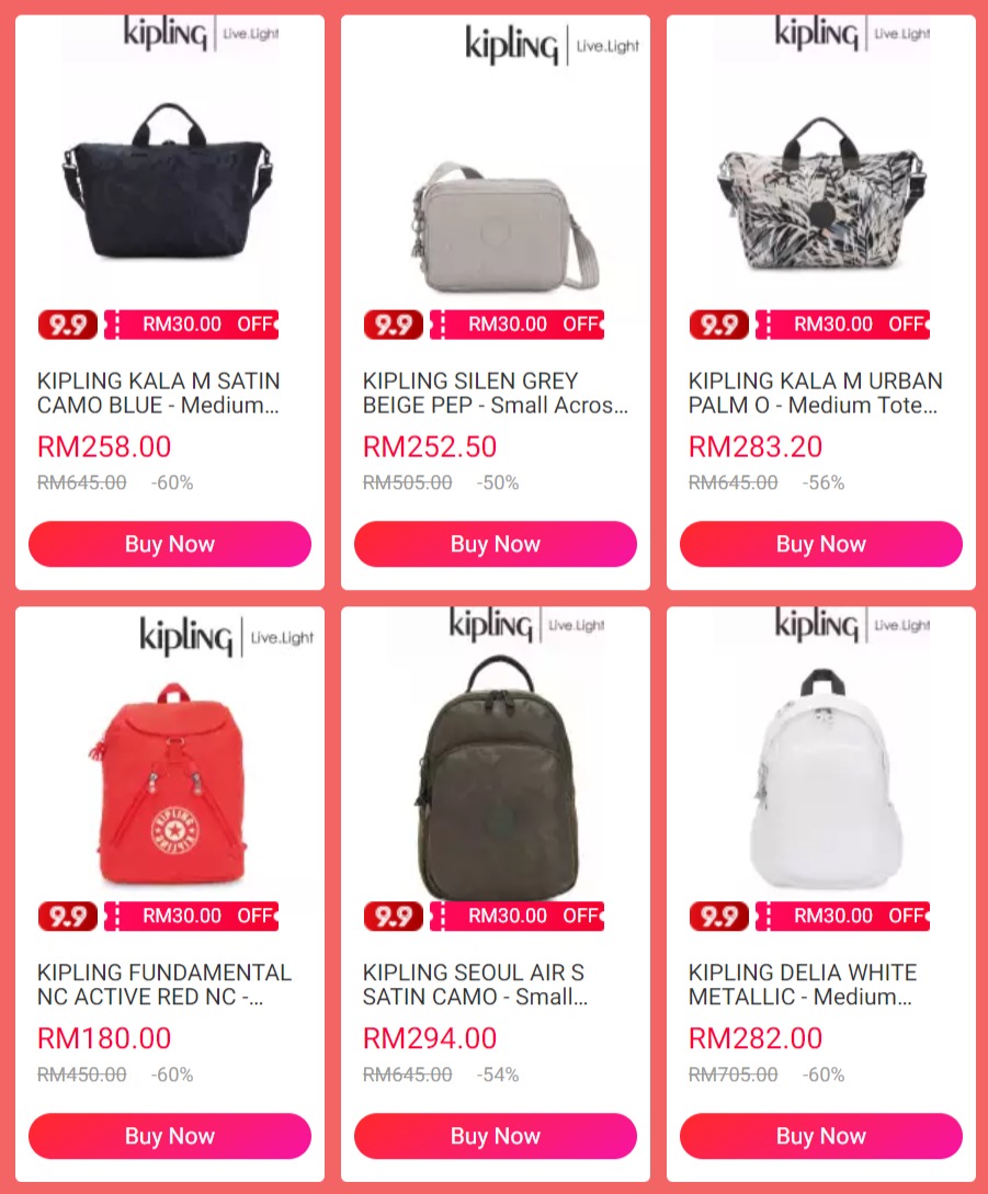 Kipling 是来自比利时的休闲箱包品牌!为了配合9.9 促销日,Kipling 推出包包高达60%折扣!再领取优惠券可额外享有RM30 折扣!