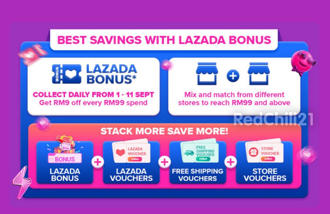 还有~从即日起至9月11日,通过Lazada App 每日领取Lazada Bonus 奖励!每消费RM99 就可额外折扣RM9!在你付款时,可参与不同的商家一起结账,以及叠加其他Lazada 折扣券哦!