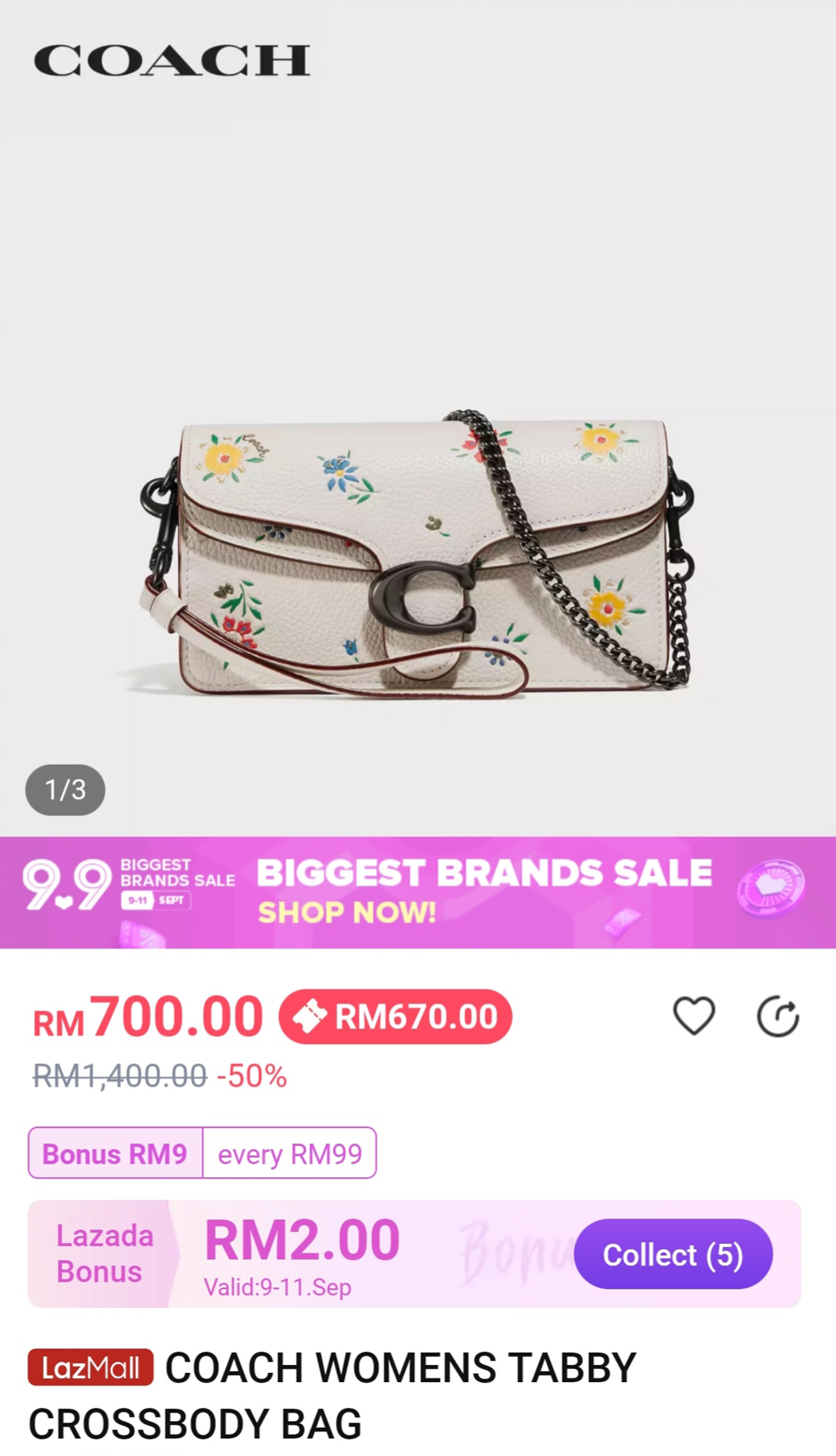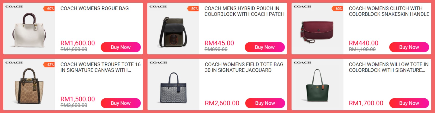▼ 例如:这款Coach Womens Tabby Crossbody Bag(原价RM1400)折扣50%+店家折扣券,只需RM670!省下RM730!