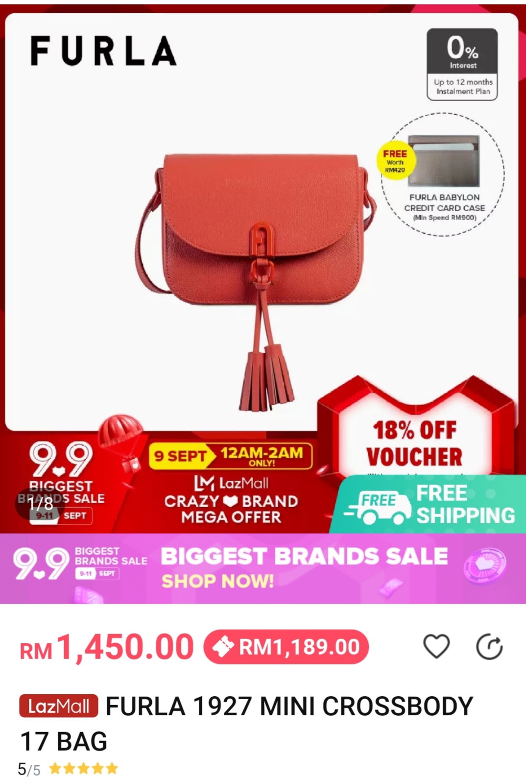 ▼ 例如:这款Furla 1927 Mini Crossbody 17 Bag(原价RM1450)领取店家折扣券,只需RM1189!省下RM261!附赠Furla Babylon Credit Card Case!