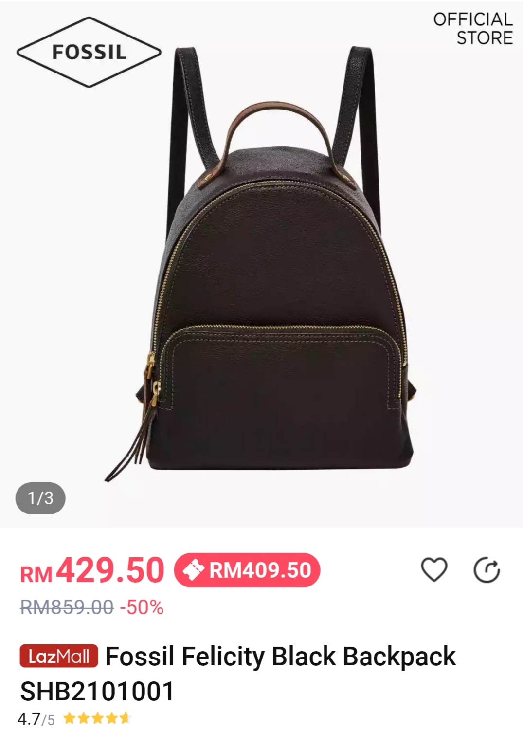 ▼ 例如:这款Fossil Felicity Black Backpack(原价RM859)折扣50%+店家折扣券,只需RM409.50!省下RM449.50!