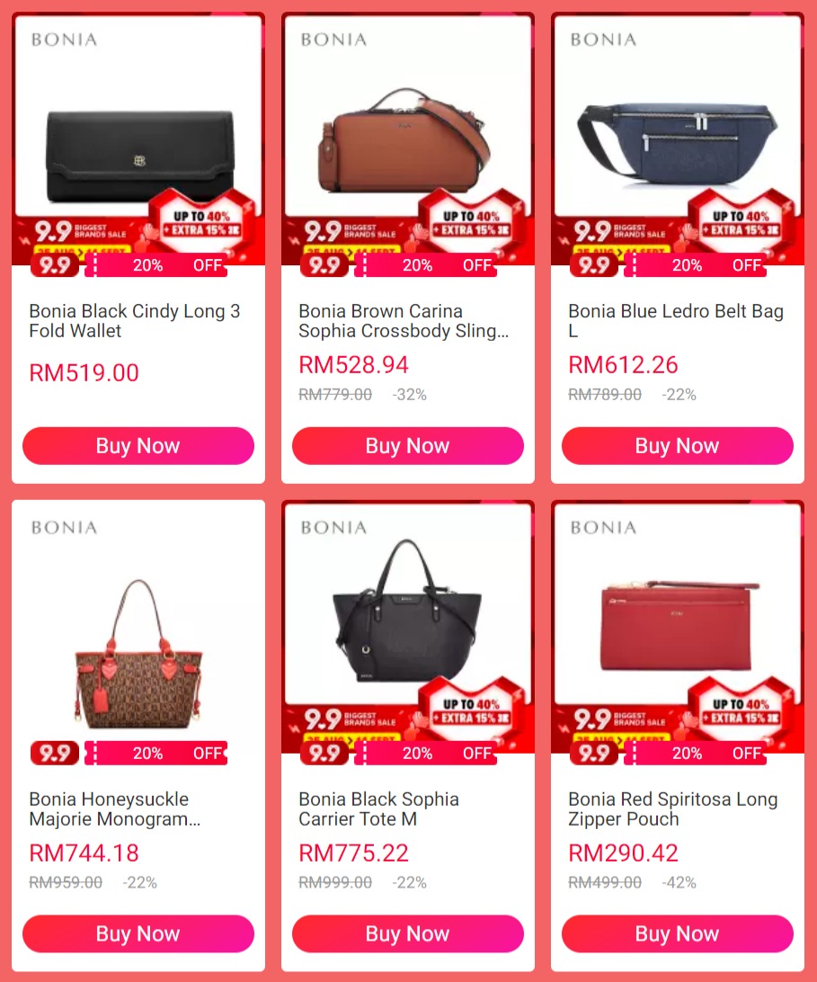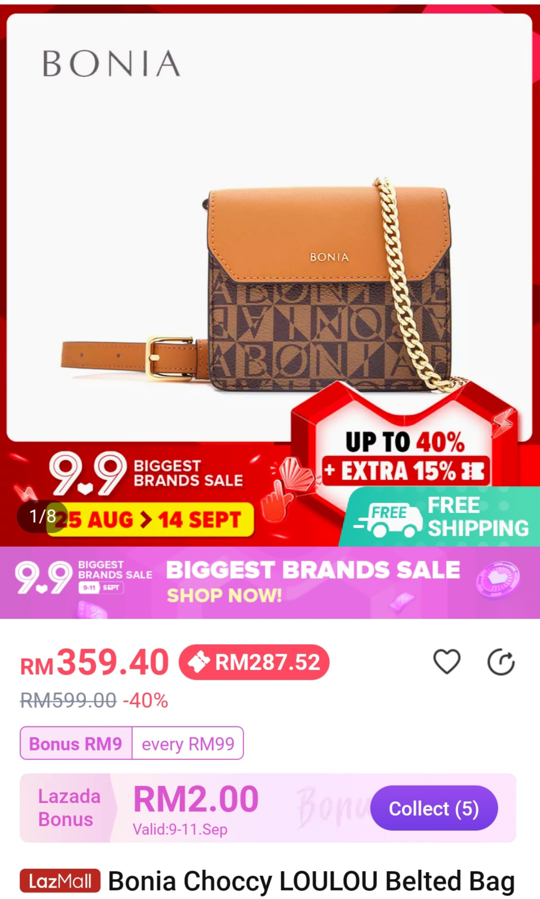 ▼ 例如:这款Bonia Choccy LOULOU Belted Bag(原价RM599)折扣40%+店家折扣券,只需RM287.52!省下RM311.48!