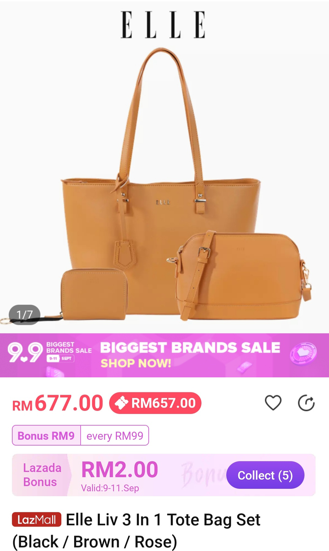 ▼ 例如:这款Elle Liv 3 In 1 Tote Bag Set(原价RM677)领取店家折扣券之后,只需RM657!