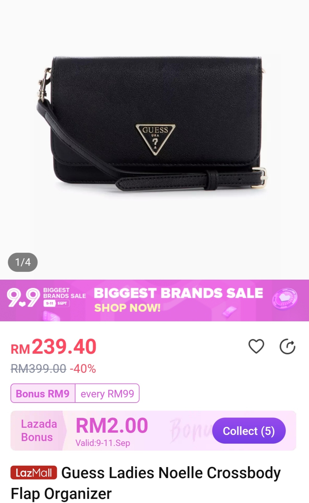 ▼ 例如:这款Guess Ladies Noelle Crossbody Flap Organizer(原价RM399)折扣40% 只需RM239.40!省下RM159.60!