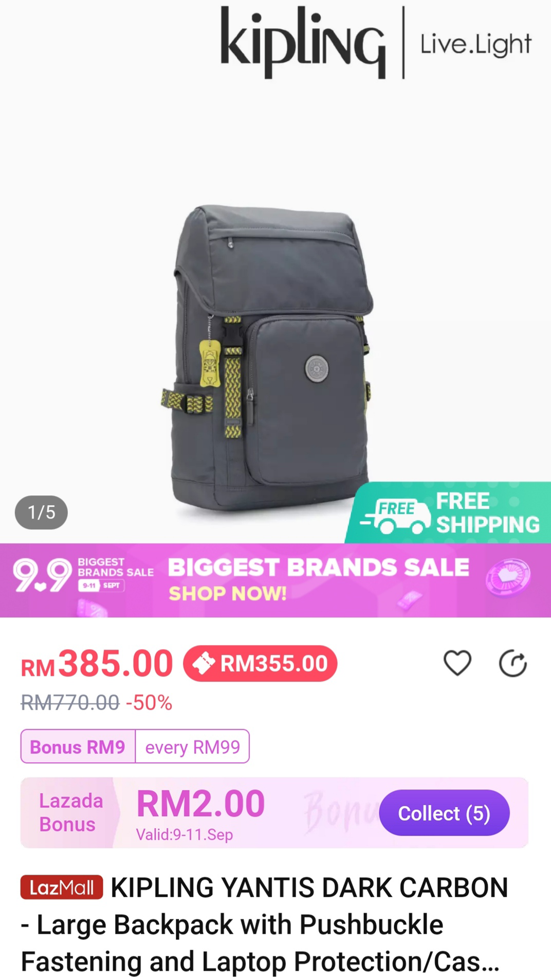 ▼ 例如:这款KIPLING YANTIS DARK CARBON – Large Backpack(原价RM770)折扣50%+店家折扣券,只需RM355!省下RM415!