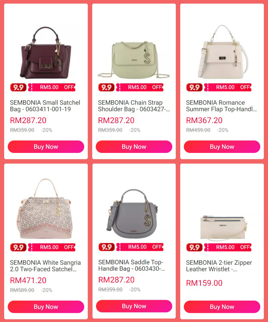 9月9日当天全场包包享有高达50%折扣,额外再获得9%折扣!别忘了领取折扣券享有RM10 折扣!