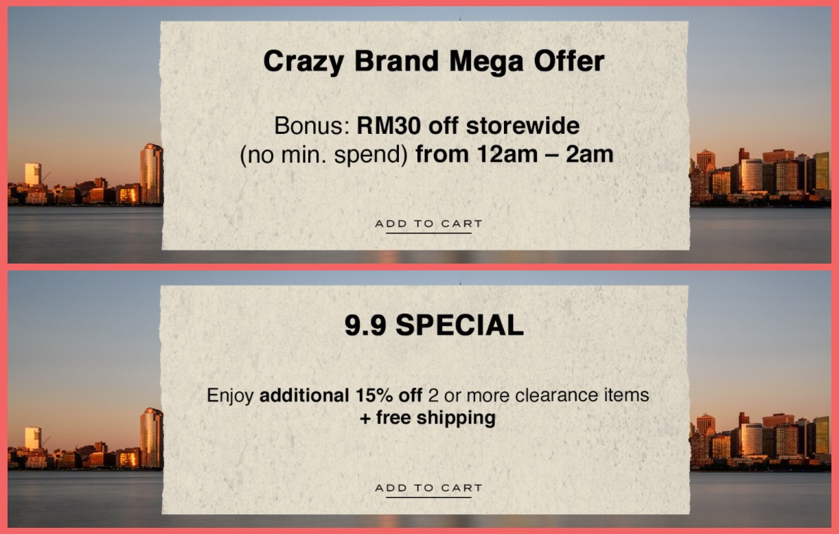 9月9日当天凌晨12am – 2am 时段推出全场折扣RM30,无限最低消费!另外购买2样清货商品可享有额外15%折扣+免邮服务!