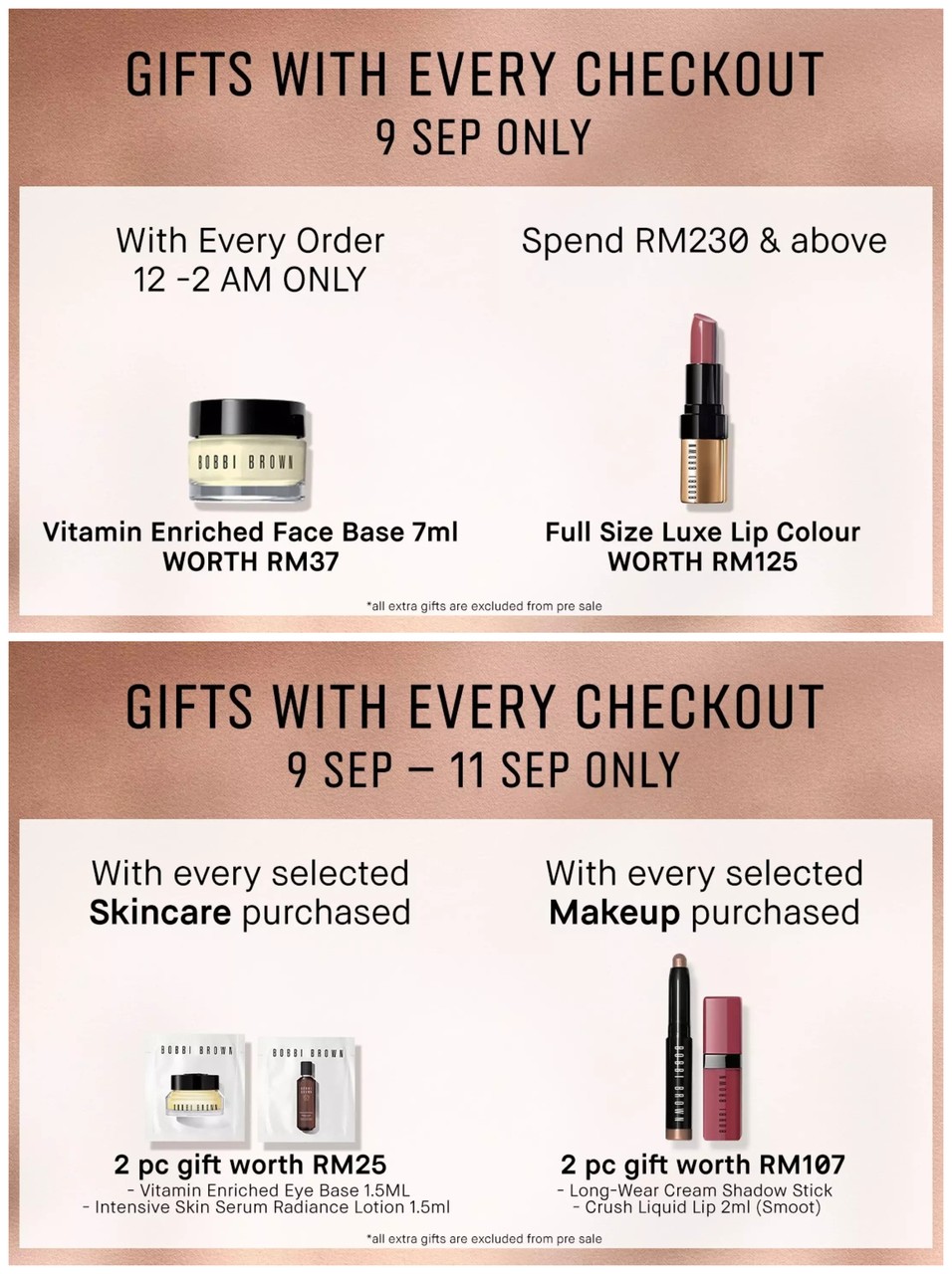 - 购买指定护肤产品免费获得Vitamin Enriched Face Base 1.5ml 和Intensive Skin Serum Radiance Lotion 1.5ml(价值RM25)