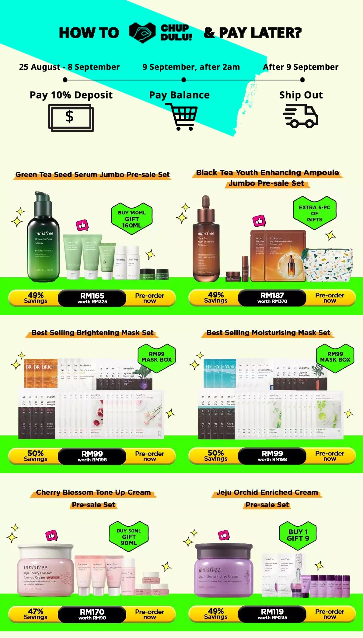 ▼ 从即日起至9月9日期间,消费RM300 可折扣RM25(不包含特价产品)!倘若消费RM150 可获得护肤赠品!