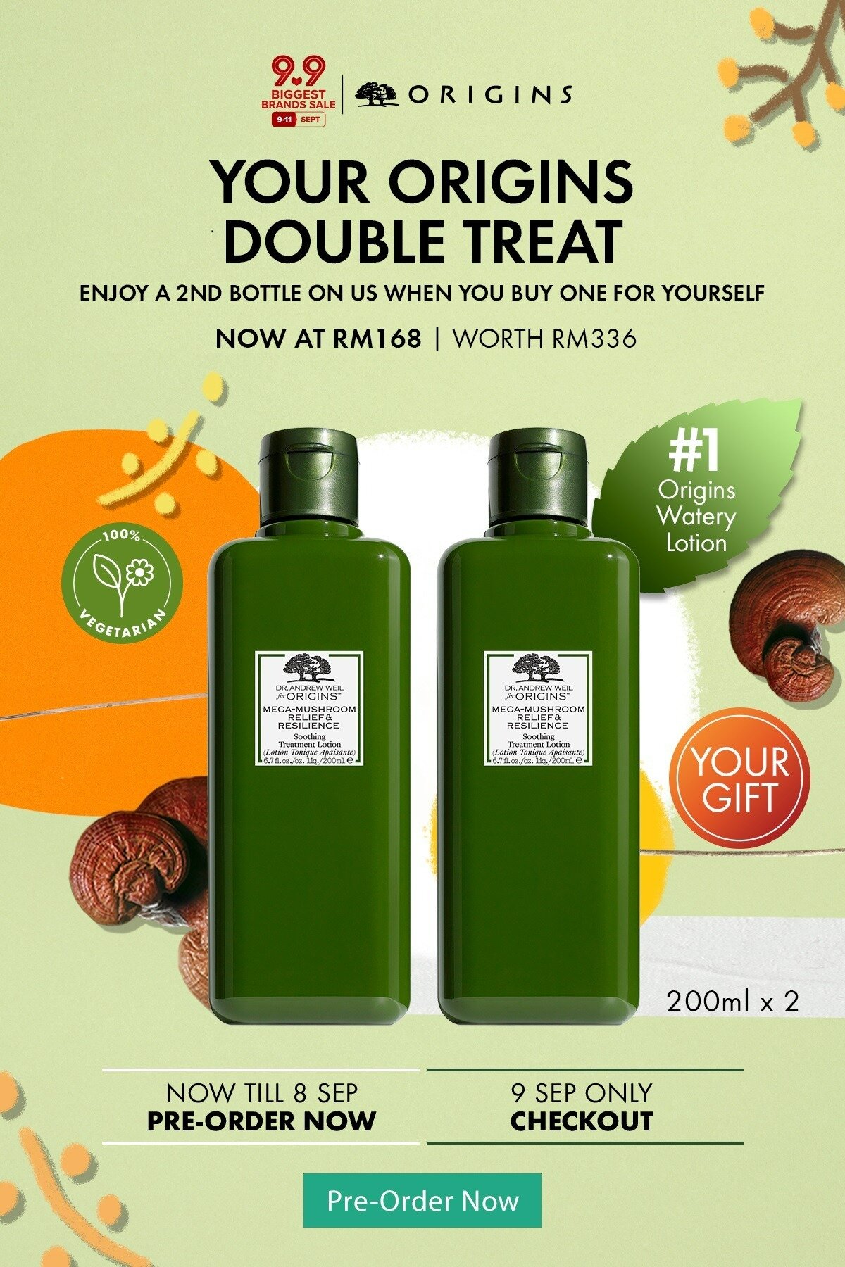 ▼ 2瓶Origins Mega-Mushroom™ Relief Resilience Soothing Treatment Lotion(200ml)只需RM168,平均一瓶只需RM84;购买【点击这里】