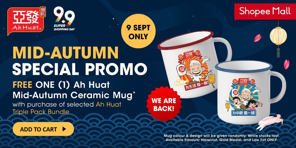 这项优惠是由Shopee 和Lazada Ah Huat 官方推出【9.9】优惠活动!只要你在9月9日当天购买Ah Huat 白咖啡套组,就可免费获得「Ah Huat 古早味马克杯」啦!