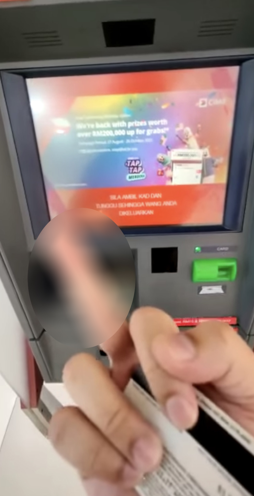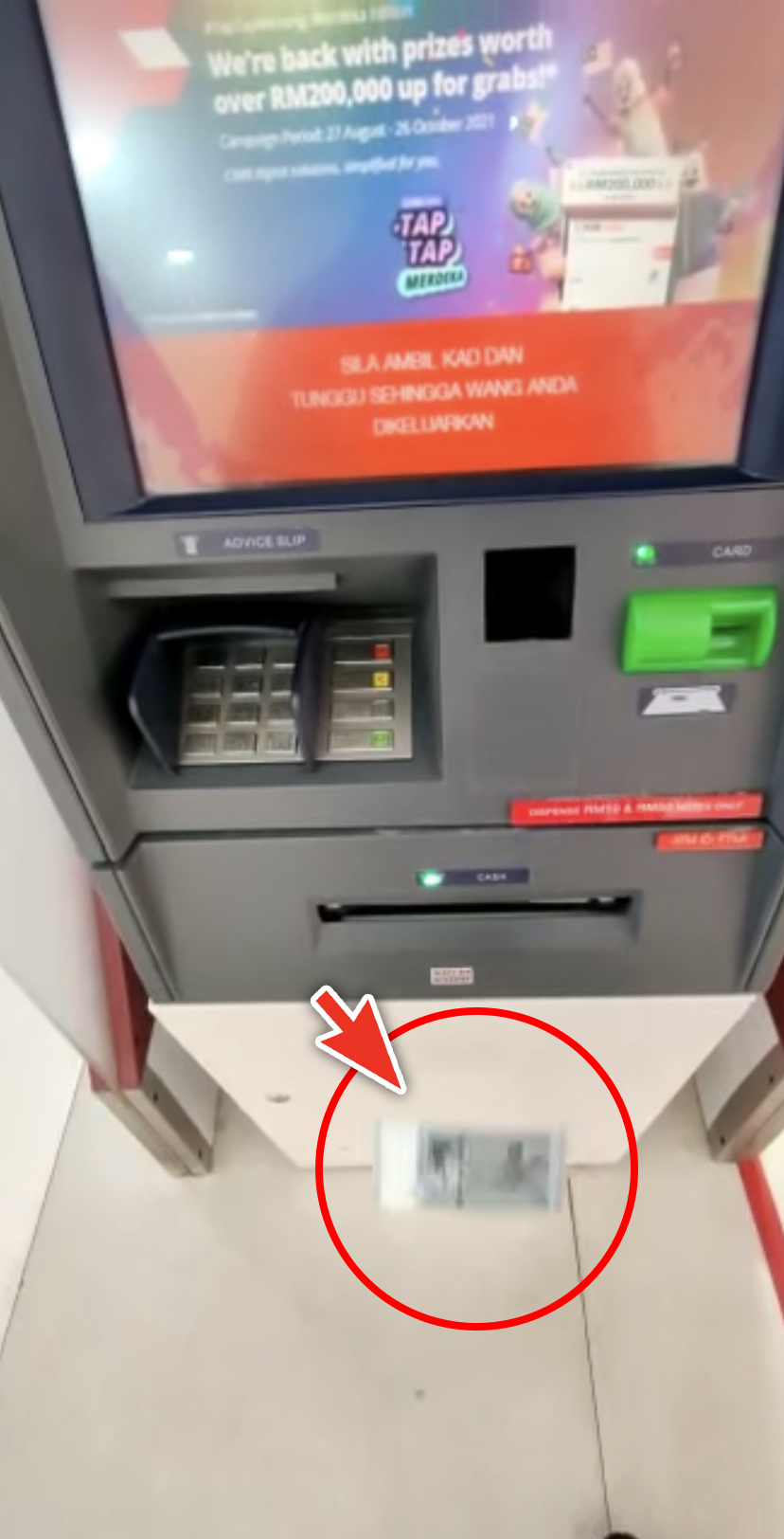 ▼ 交易成功!男事主先是取了银行卡,然后 ATM 的现金就出来了。不过这个画面却有些不同,一张张RM50钞票竟然是“飞”着出来的!