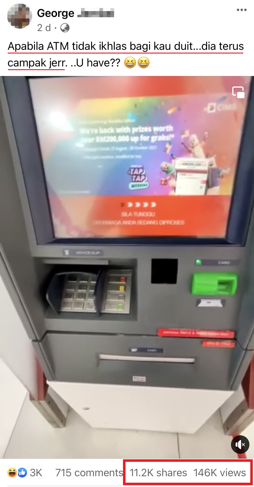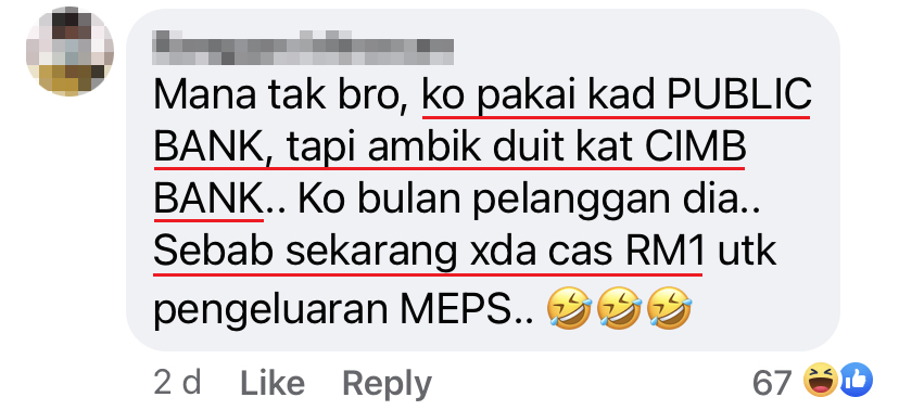 ▼ 眼尖的网友看出了真正的原因:因为提款机是 CIMB 的,但银行卡是 Public Bank 的啦~