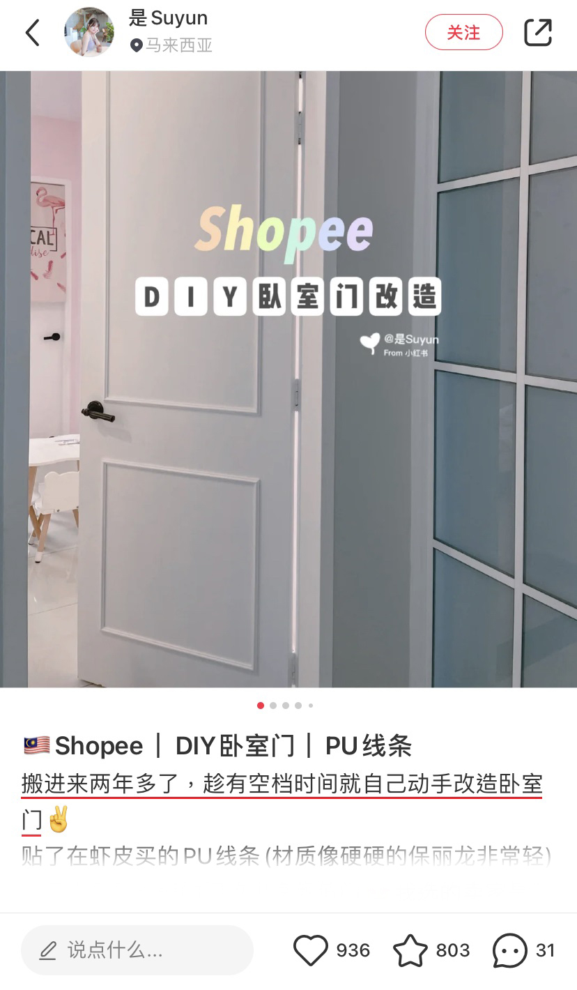 大马博主“是Suyun”近日在小红书分享改造成果,自己网购所需的材料然后DIY家里的房门,原本设计单调的白色房门瞬间升华了不少,时尚感MAX!