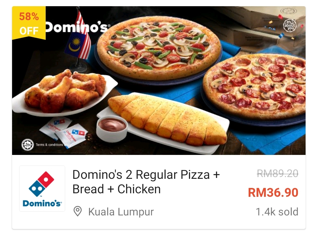 ▼ 2份 Domino’s Regular Pizza + Bread + Chicken – RM36.90