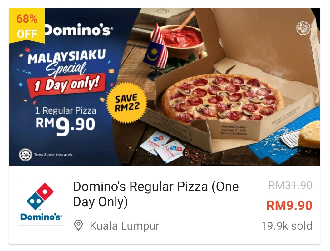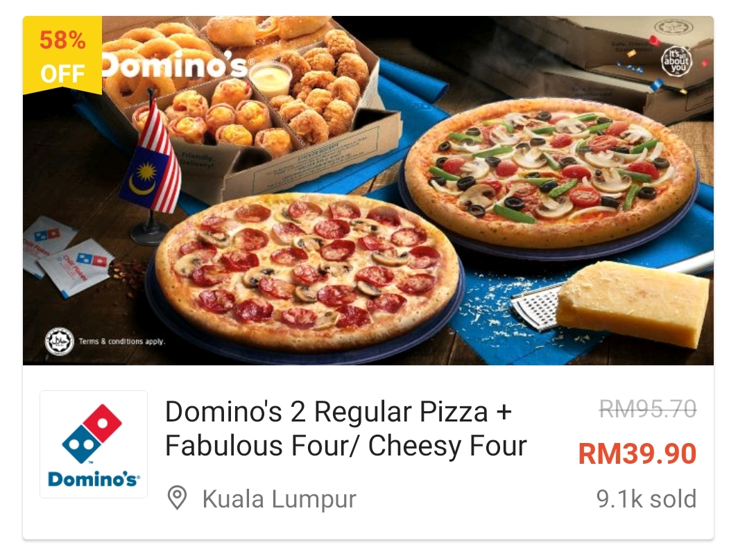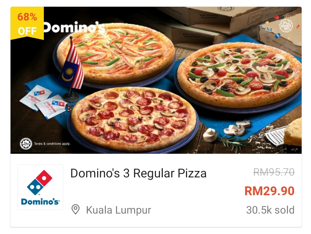 这项优惠是由Shopee 推出Domino’s Pizza 美食券!1份Regular Pizza 只需RM9.90!购买美食券之后,通过Domino’s Pizza 官网兑换并选择外送、外带或Drive-Thru 方式领取你的Pizza!