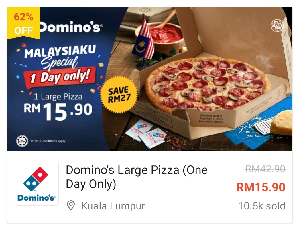 ▼ 1份Domino’s Large Pizza(1天优惠) – RM15.90