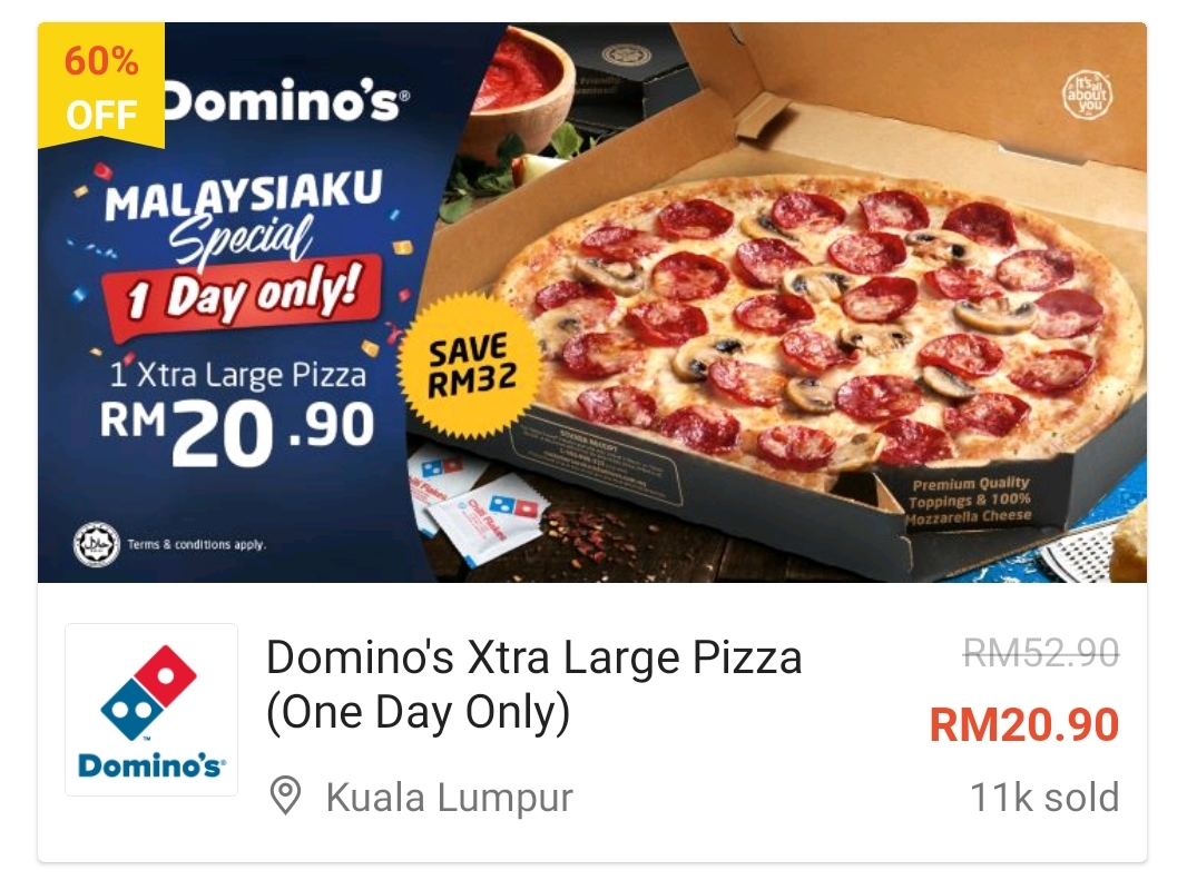▼ 1份Domino’s Xtra Large Pizza(1天优惠) – RM20.90