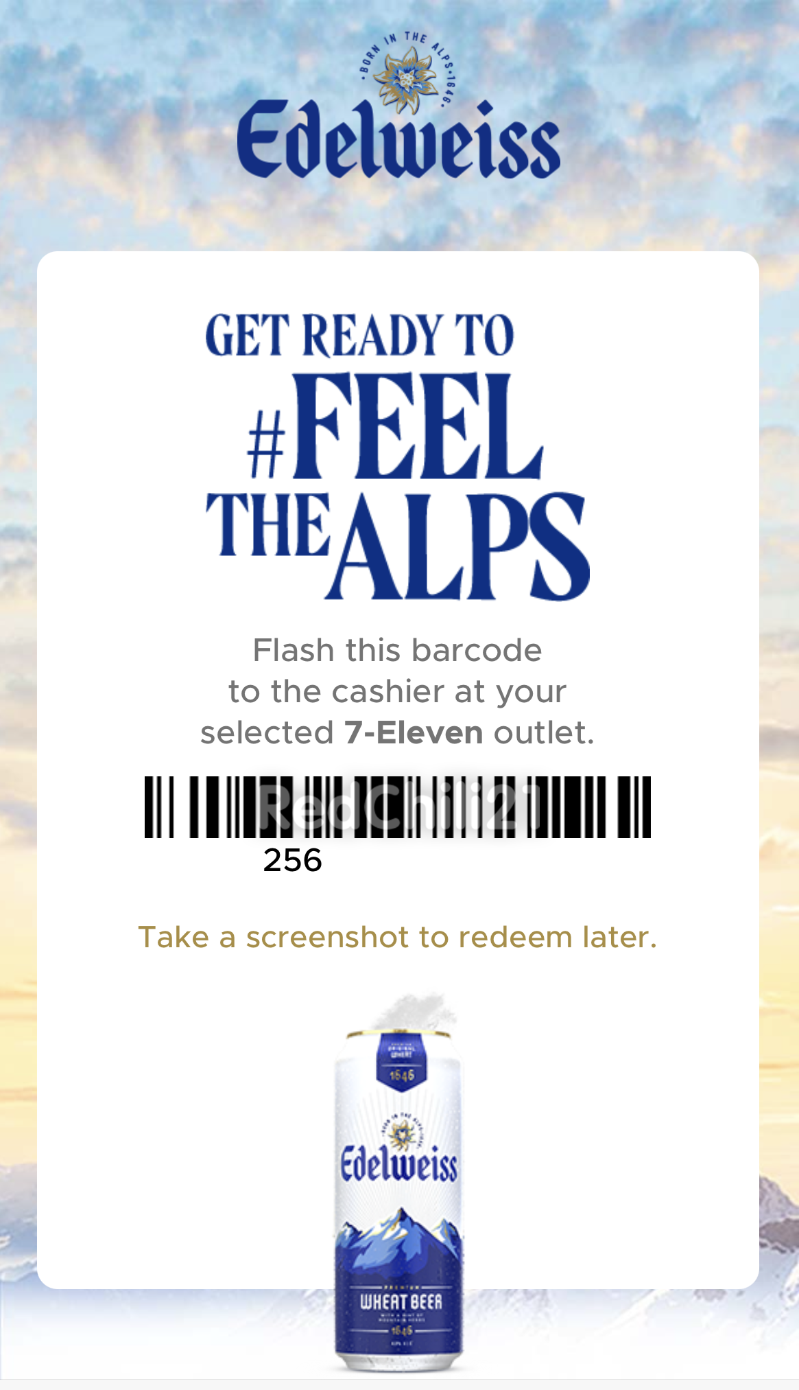 ▼ 步骤7:记得截图并前往临近指定的7-Eleven 领取免费Edelweiss 啤酒!