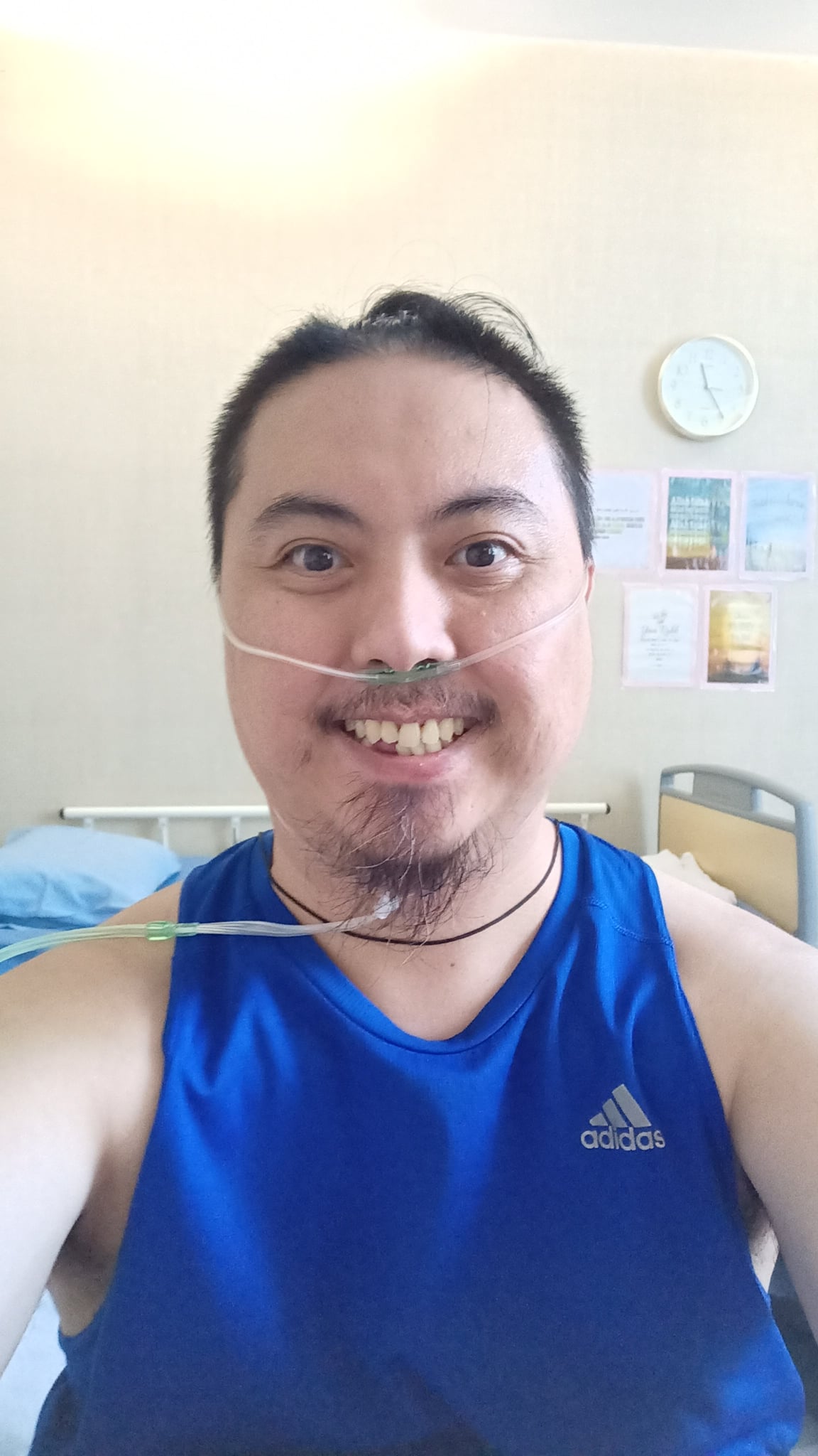 三天后,经过医生的两次调低氧气,我开始适应,并能在血氧稳定在94%左右开始拆罩训练,在房里走动,此时肺部呼吸量是非常少的,急促且疲累。隔天,医生替我患上了挂鼻型氧气管,并再次降低氧气含量。我和 Wai ling 欣喜不已,因为每降低一次氧气含量,就代表我靠近康复再近一步。
