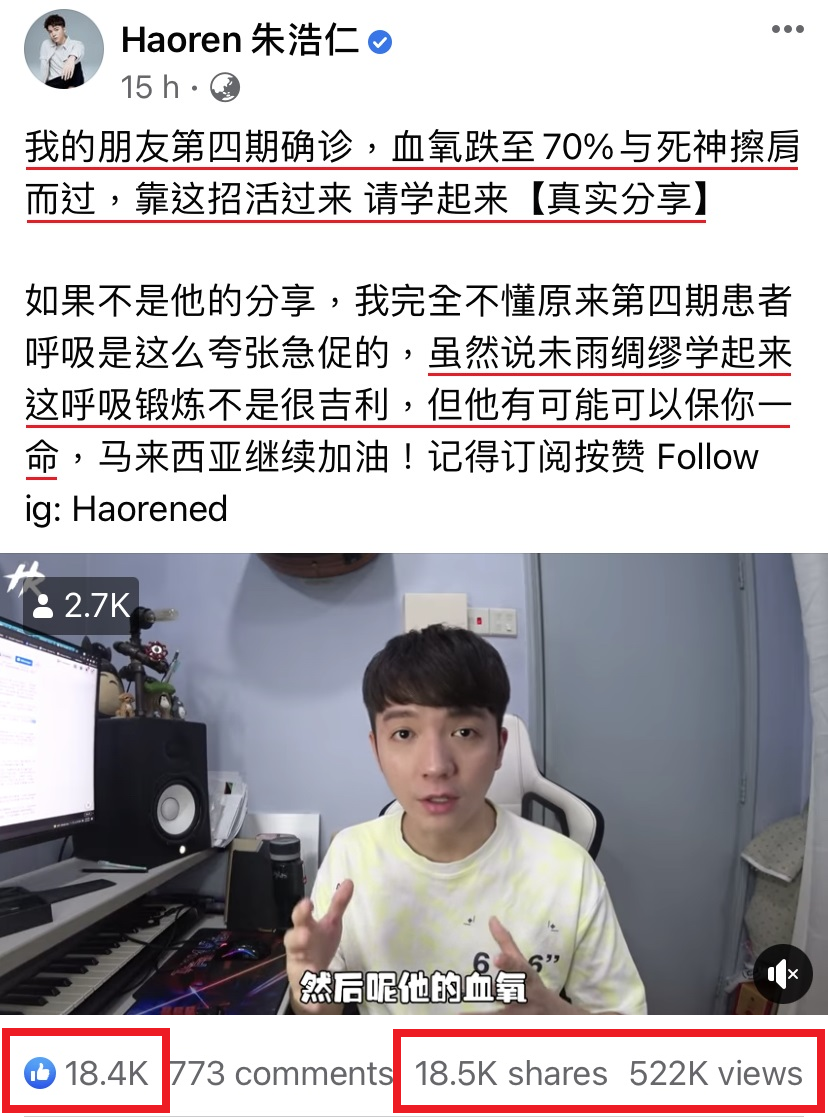 大马艺人朱浩仁昨天在官方脸书上传一段长达15分钟的视频,叙述友人确诊新冠肺炎第四期的亲身经历,靠着一招自救方式让他成功活了下来!