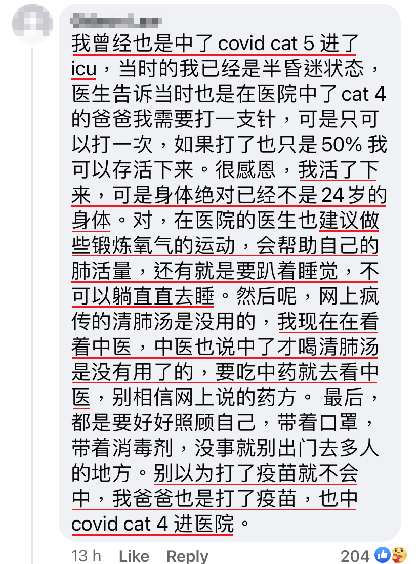 上天保佑,精神趋渐变好,能够排泄,自行抹身清洁。但检测报告结果,说我的肺部已损伤50-75%,庆幸的是心脏肾脏没受影响,而肺部也无凝血,也无三高糖尿,所以康复率还是很高的。相比邻床那些被推走的病友,我开始相信,除了医院的尽力医治,清肺排毒汤拥有极佳的效果。