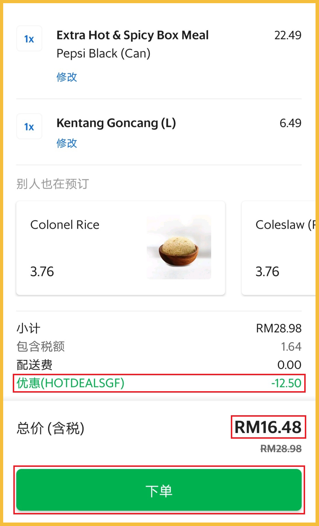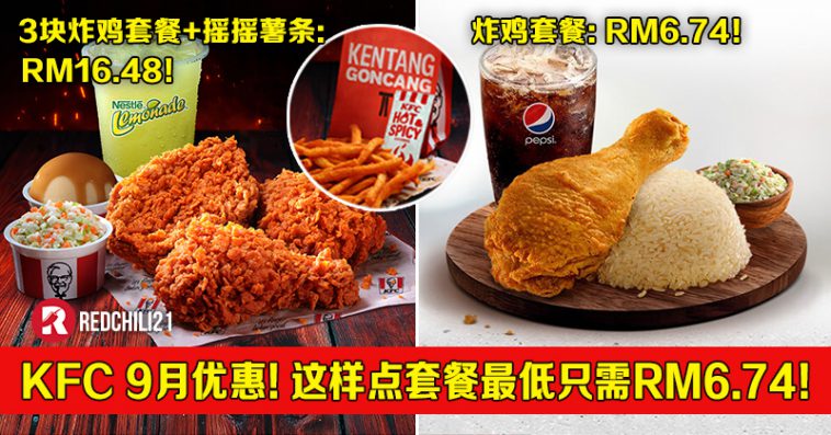 在这9月份,只要你使用GrabFood 订购KFC 美食,可享有50%折扣哦!一份新品3-pc Extra Hot & Spicy Combo + Kentang Goncang只需RM16.48!