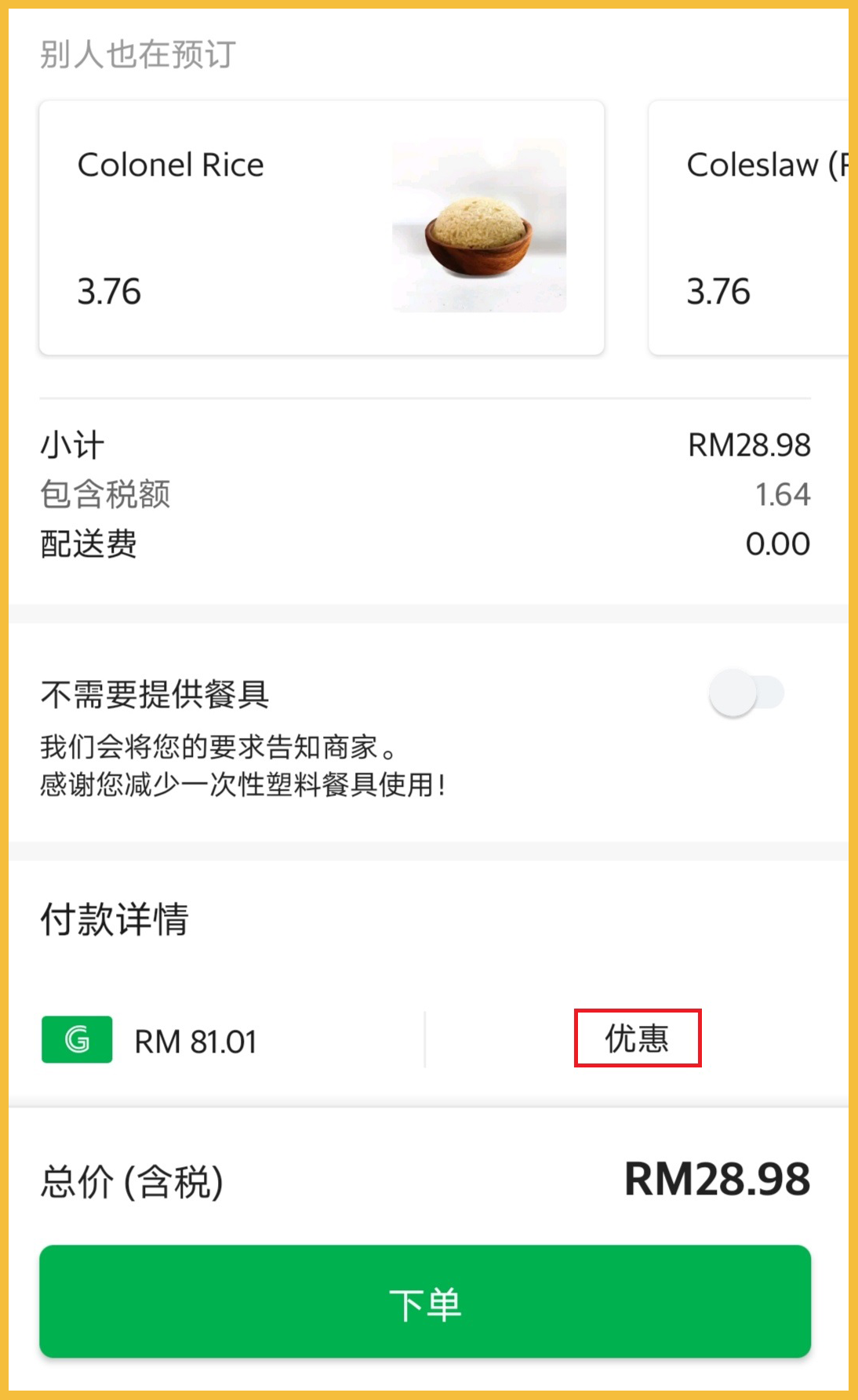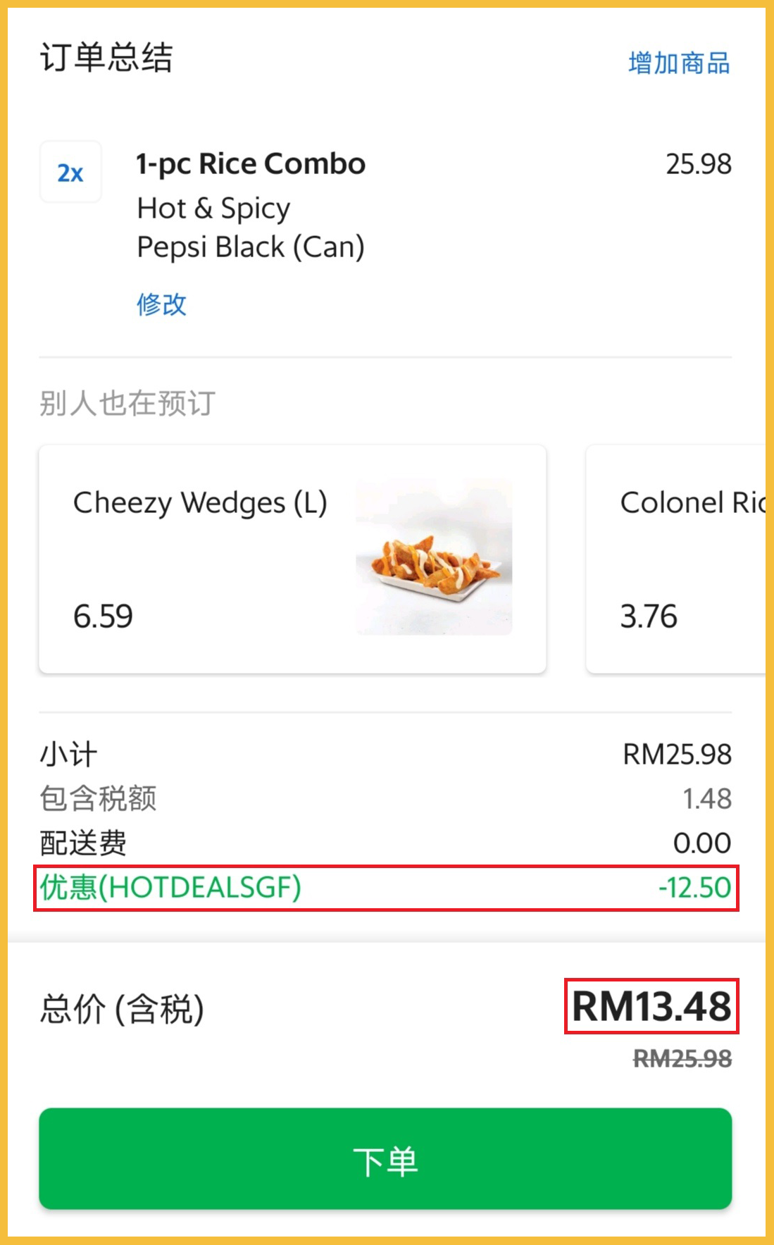 喜爱吃KFC 的朋友,如今使用GrabFood 订购KFC 可享有50%折扣!赶紧拿起手机订购吧!