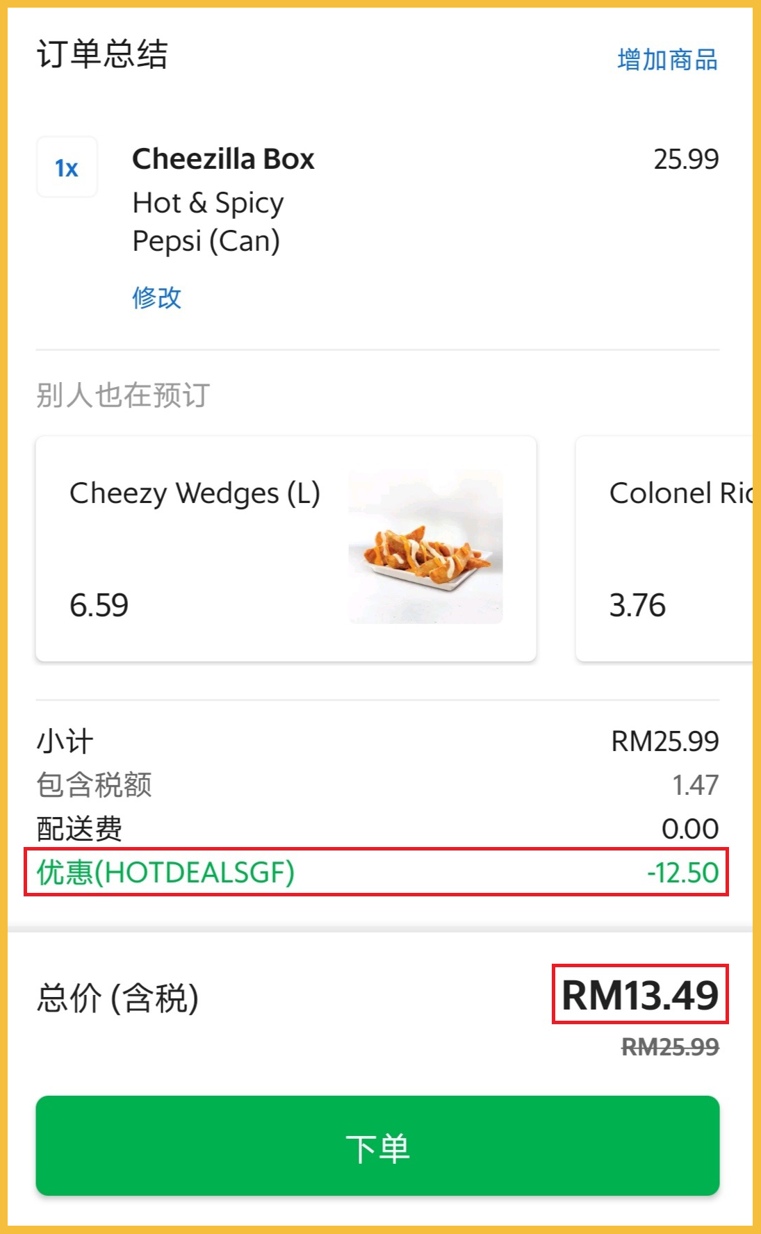 ▼ 同样的~你也可以使用这个优惠码来订购其他KFC 套餐!例如:Cheezilla Box 或1-pc Rice Combo!