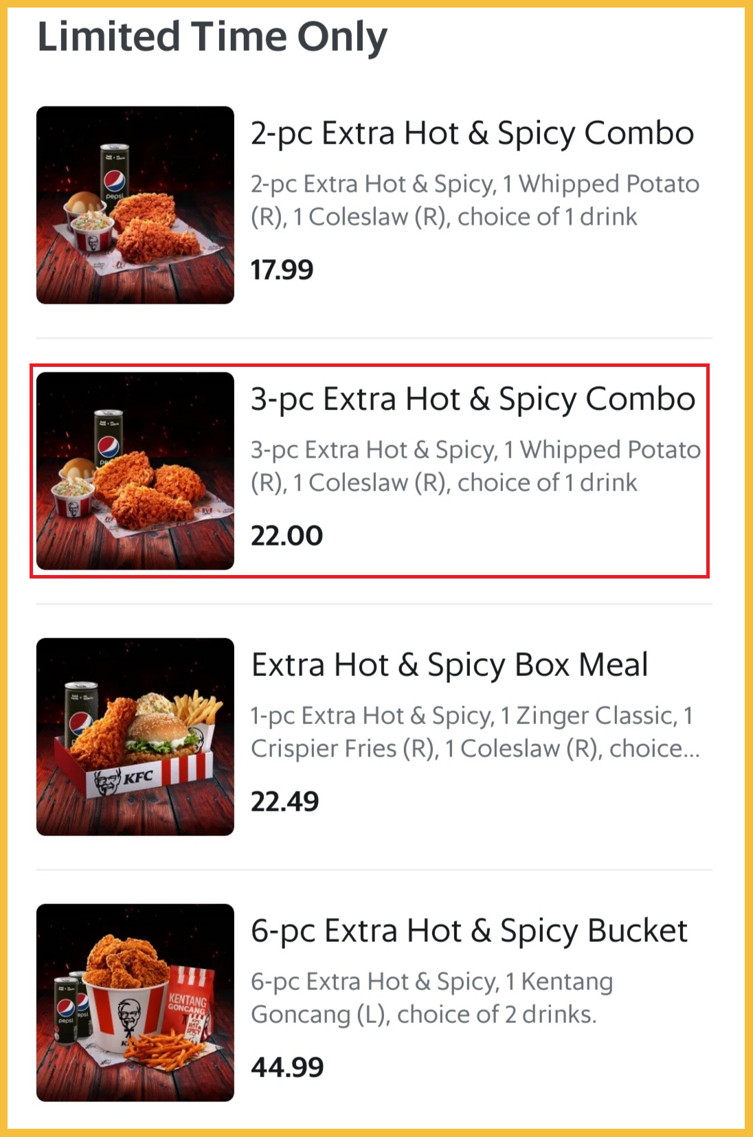 步骤 2:选择餐点!例如:3-pc Extra Hot & Spicy Combo。