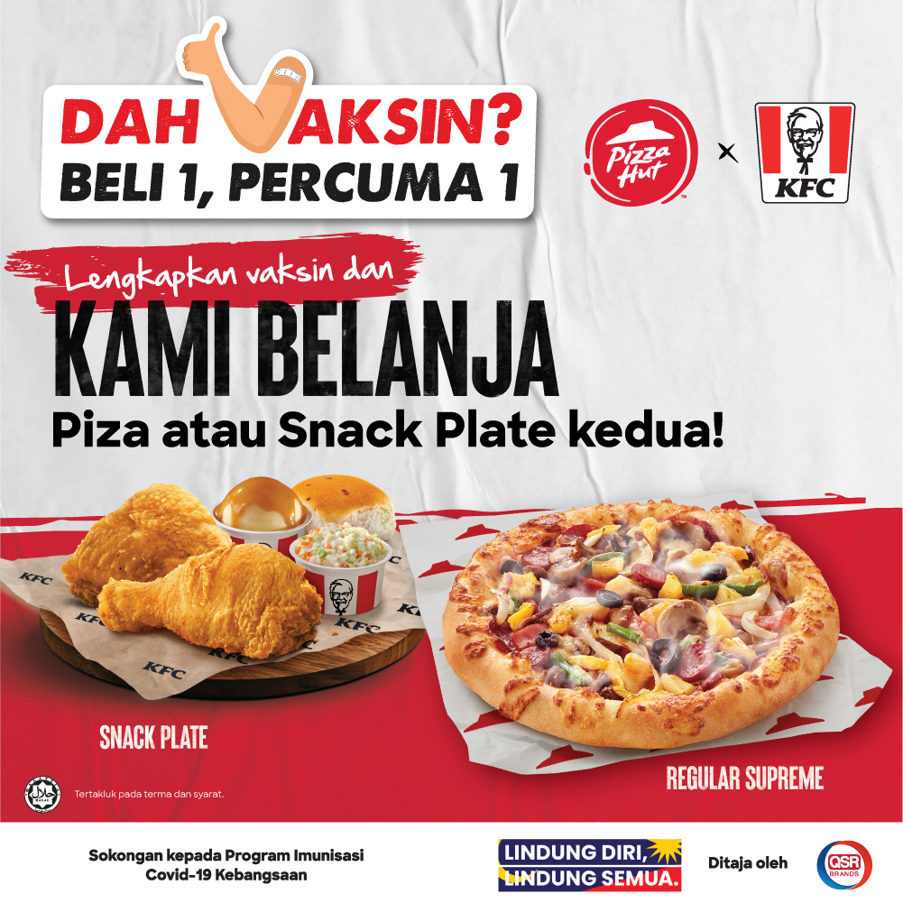 只要你已完成两剂疫苗接种,就可享有这项优惠!只需购买一份套餐,KFC 将免费送出一份价值RM13.49 的KFC Snack Plate,或由Pizza Hut 送出1份价值RM 29.90 Regular Supreme !