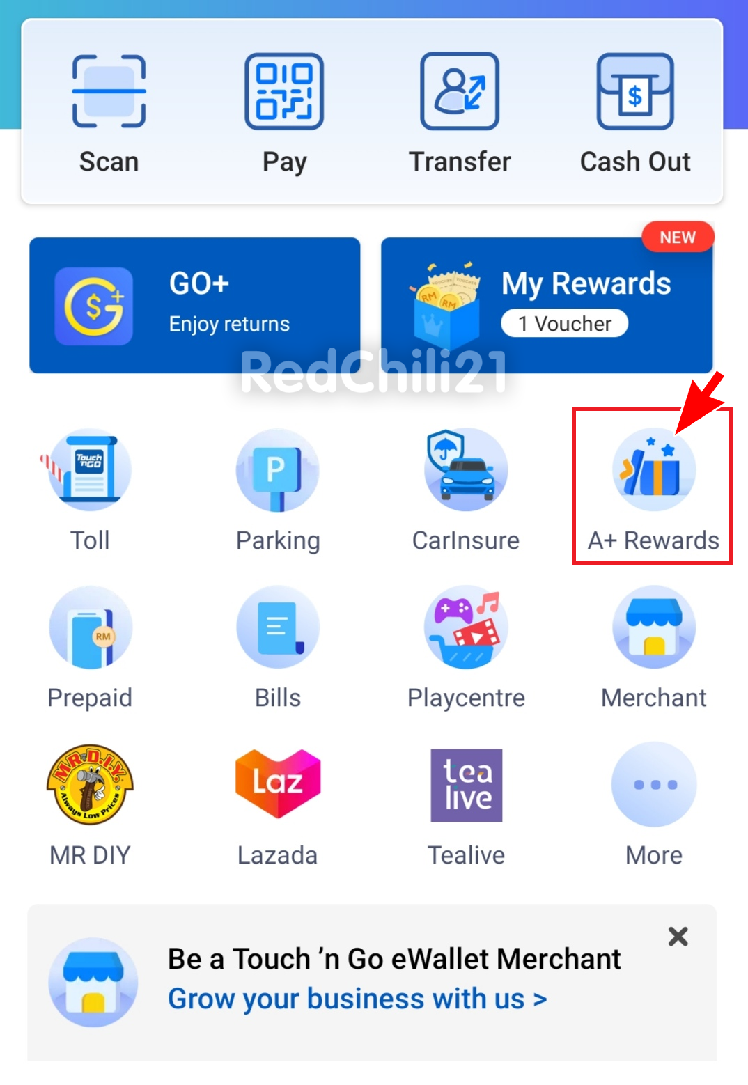 步骤1:打开Touch’N Go e-Wallet App,点击“A+Rewards”。