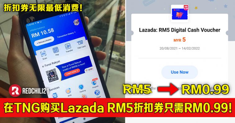那是要如何领取呢?!只要你通过Touch’N Go 电子钱包以RM0.99 优惠价格来购买一张RM5 Lazada 电子折扣券就行了!且折扣券还是无限制最低消费哦!