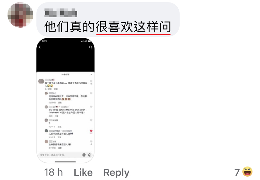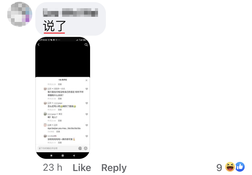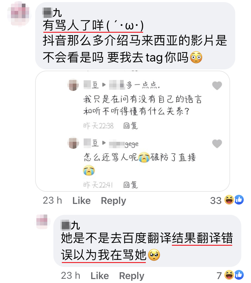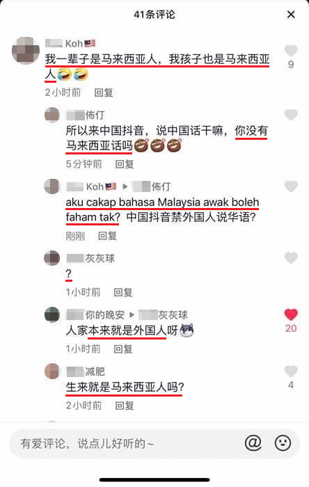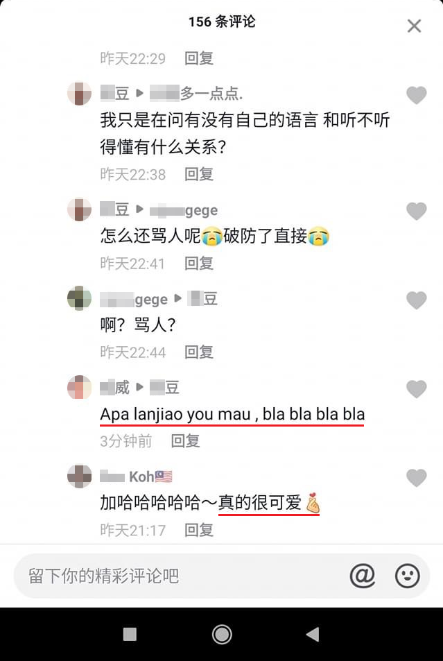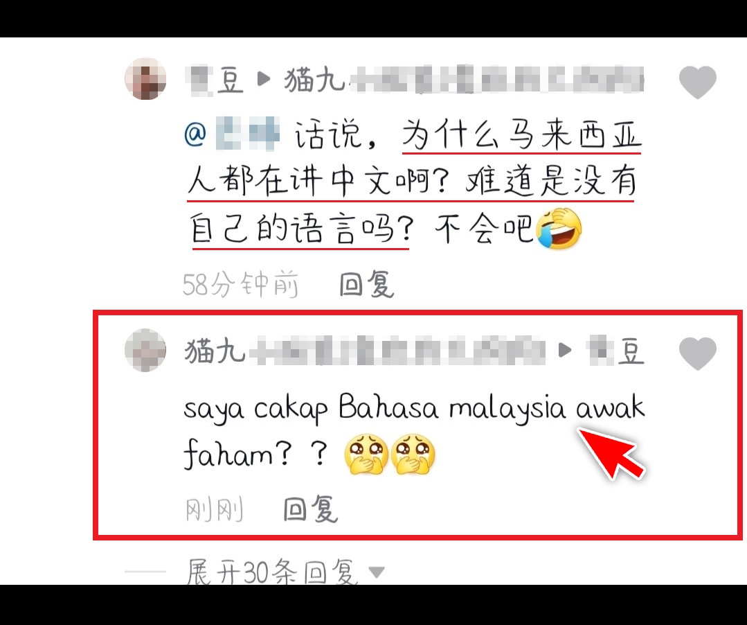 该名大马网友“猫九”近日在中国抖音App上看到一段影片,并在下方的评论区用中文写了一条评论,结果无端端地就被一位中国网民故意评论酸他:「话说,为什么马来西亚人都在讲中文啊?难道是没有自己的语言吗?不会吧?」