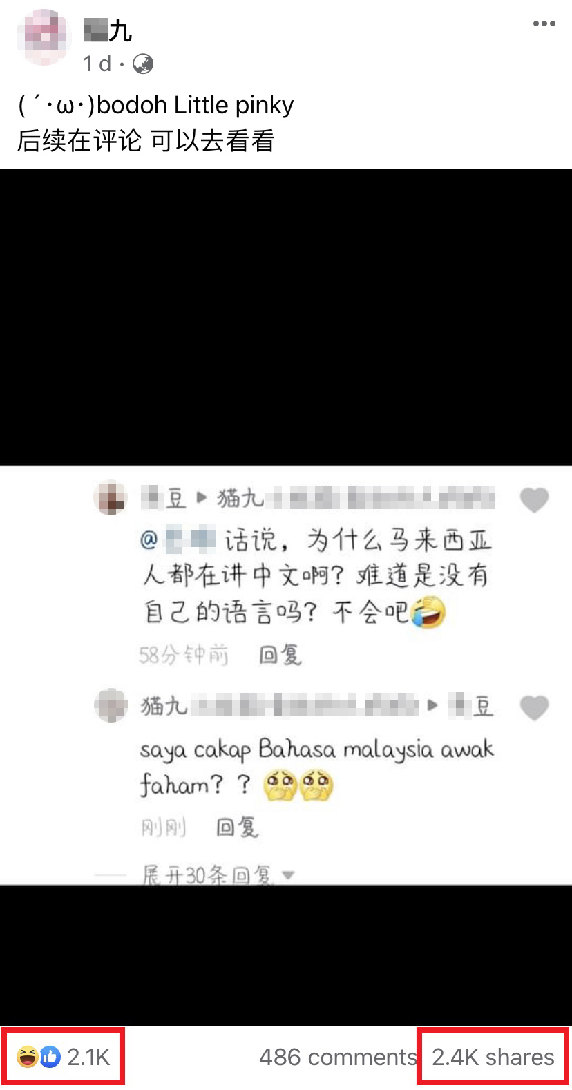 该名大马网友将抖音的评论截图下来并分享至脸书,接着就引发留言区的热烈讨论,不到2天内累计了超过2,400次分享以及2,100点赞。