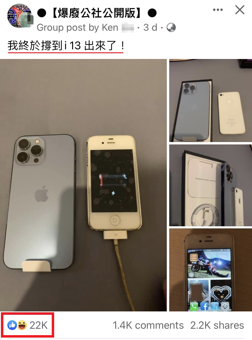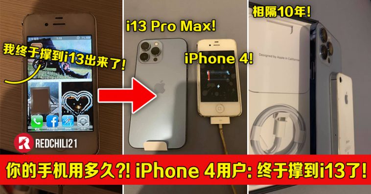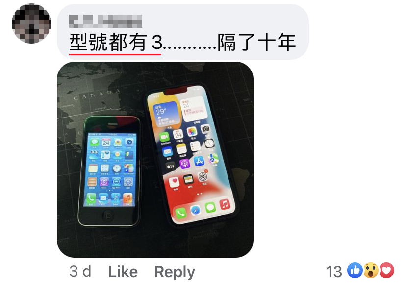 原PO在帖文里感叹地写道:「我终于撑到 iPhone 13 出来了!」照片中有两台 iPhone,一台是苹果手机的“古董”—— iPhone 4,另一台则是原PO刚入手的 iPhone 13 Pro Max。(给大家科普一下,iPhone 4 是2010年的手机,今年是2021年了…)