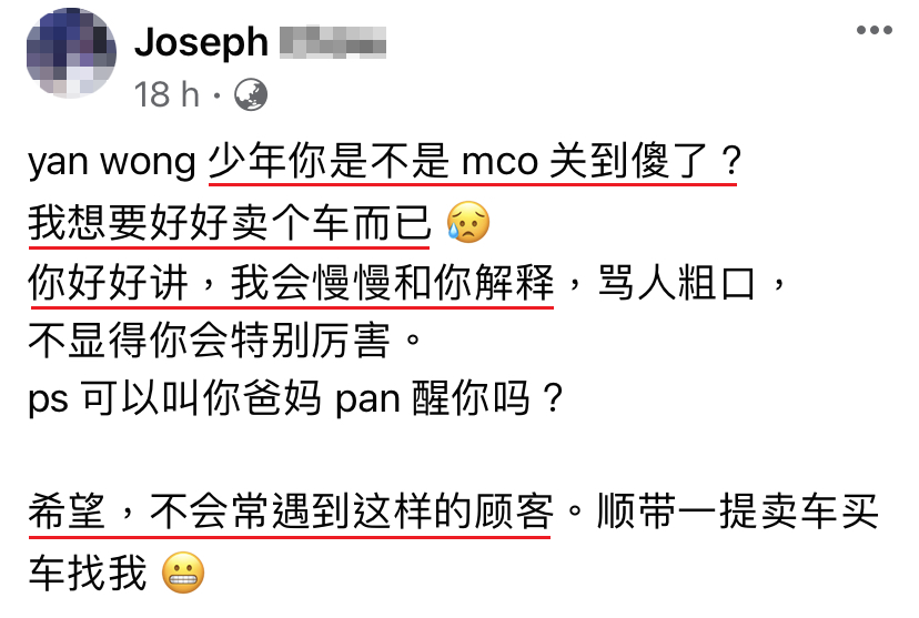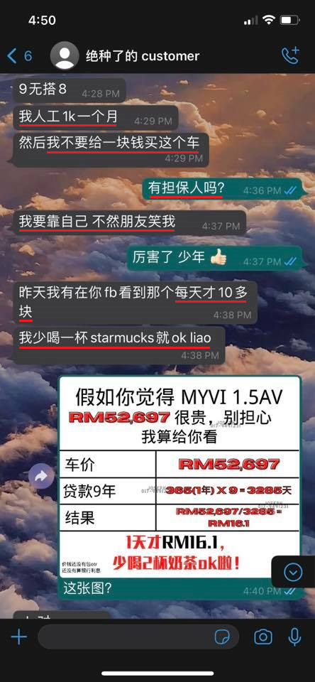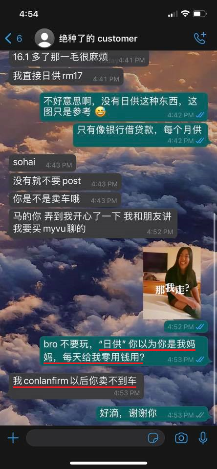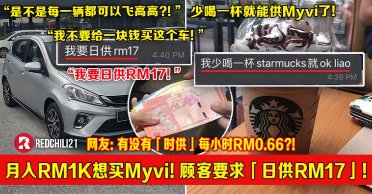 大马一名 Perodua 销售员近日遇到一名奇葩顾客,月入RM1,000想要买全新的 Myvi,重点是他不要月供,他只要日供RM17,最后还恼羞成怒对销售员破口大骂!