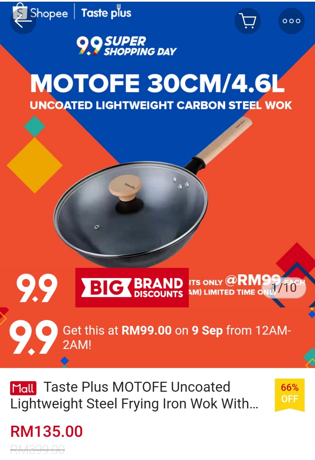 ▪ Taste Plus MOTOFE Uncoated Lightweight Steel Frying Iron Wok With Lid and Suitable For Gas Stove (30cm/4.6L) – RM399 RM99