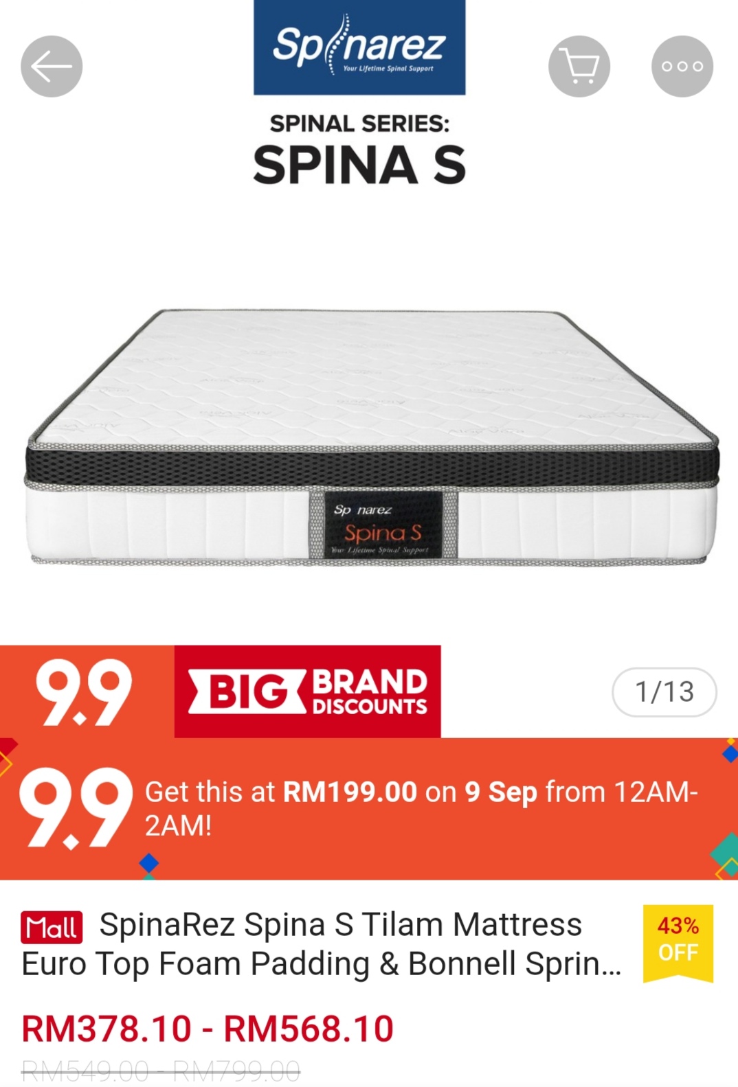 ▪ SpinaRez Spina S Tilam Mattress Euro Top Foam Padding & Bonnell Spring Hybrid + Coconut Fiber (10″) Queen – RM699 RM199