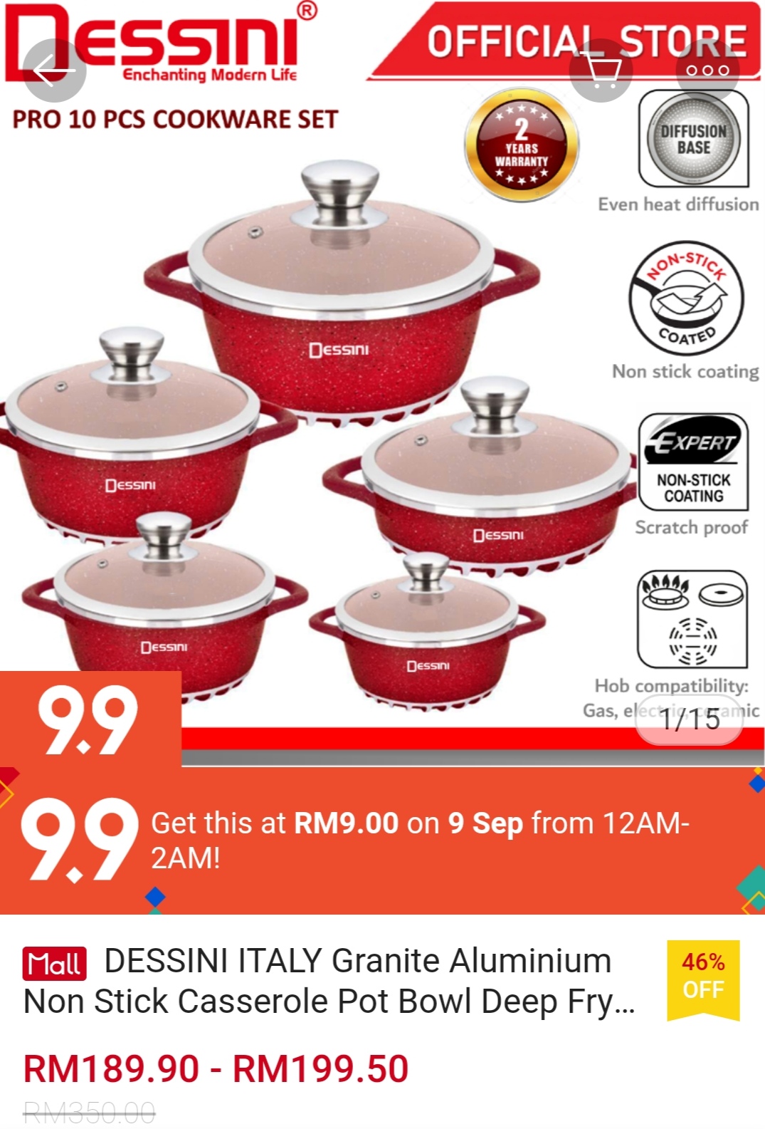 ▪ DESSINI ITALY Granite Aluminium Non Stick Casserole Pot Bowl Deep Fry Pan Cookware Tool (10 Pcs) – RM350 RM9