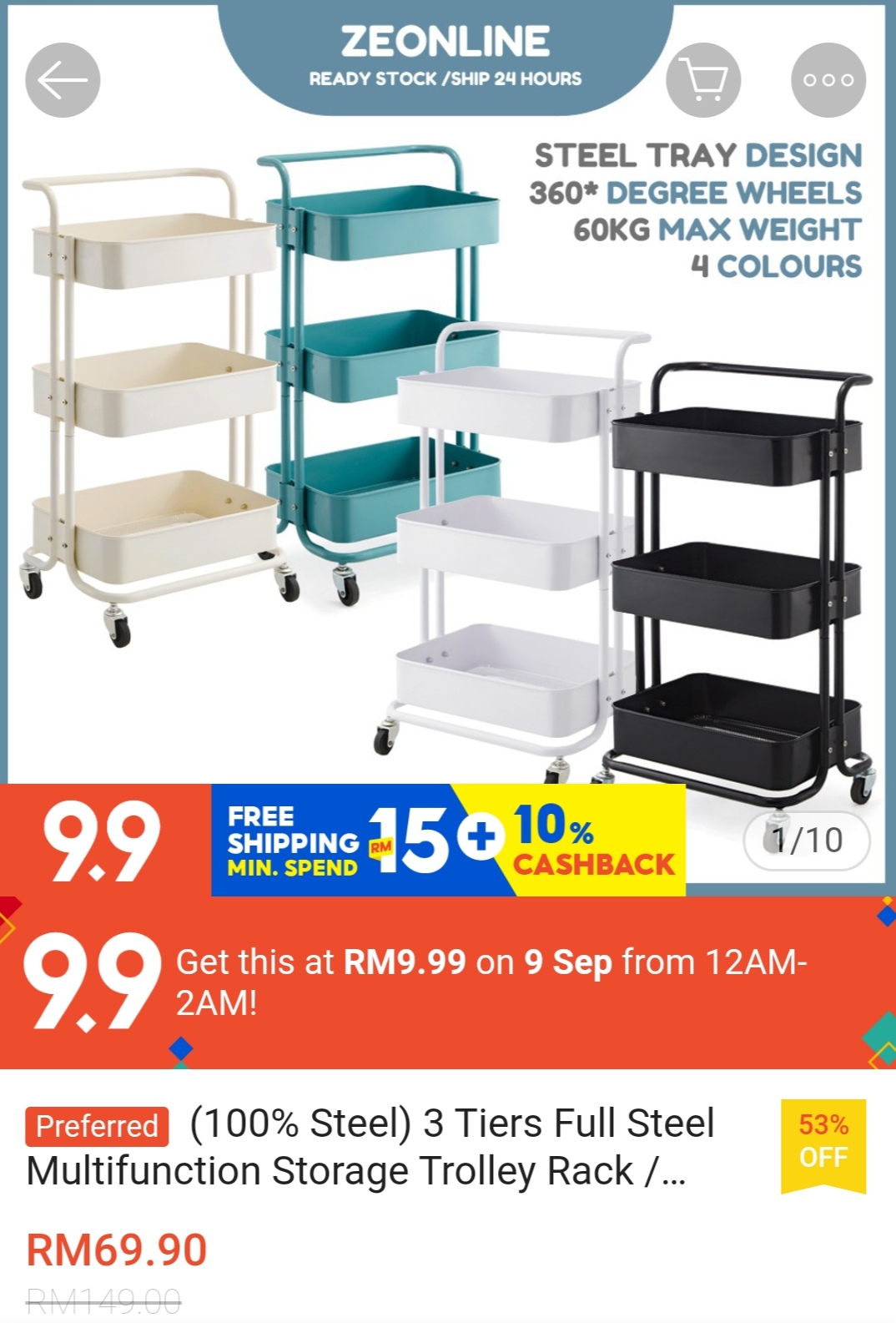 ▪ 3 Tiers Full Steel Multifunction Storage Trolley Rack – RM149 RM9.99