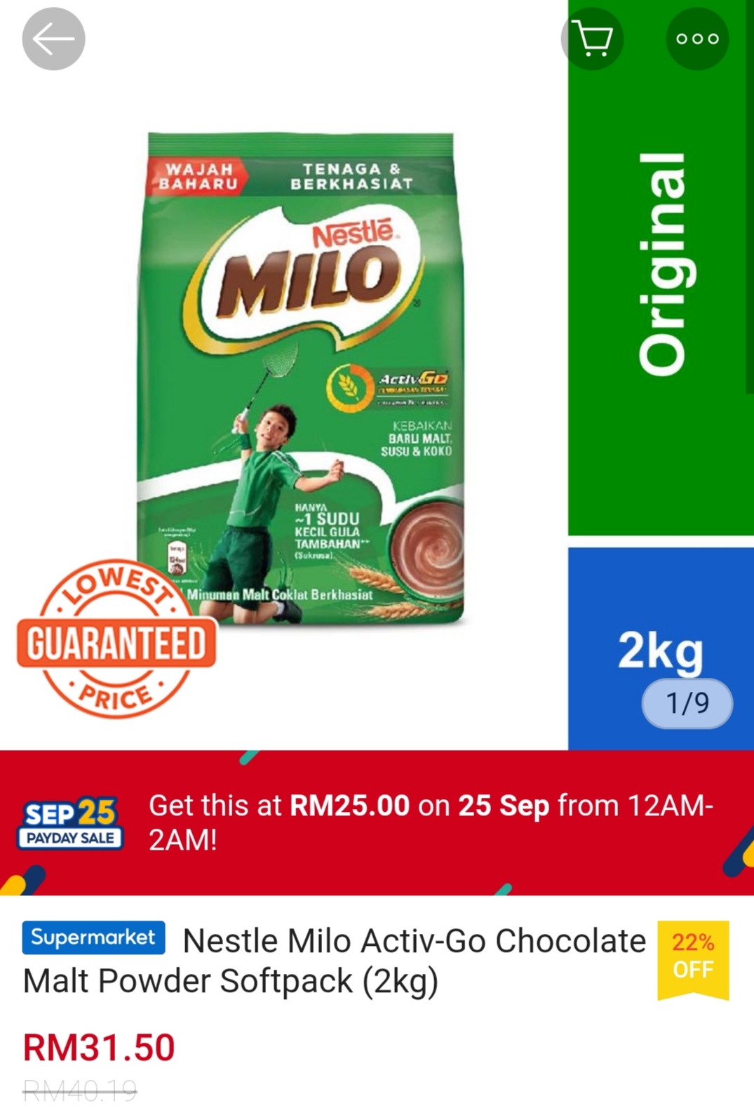 ▪ Nestle Milo Activ-Go Chocolate Malt Powder Softpack (2kg) – RM31.50 RM25
