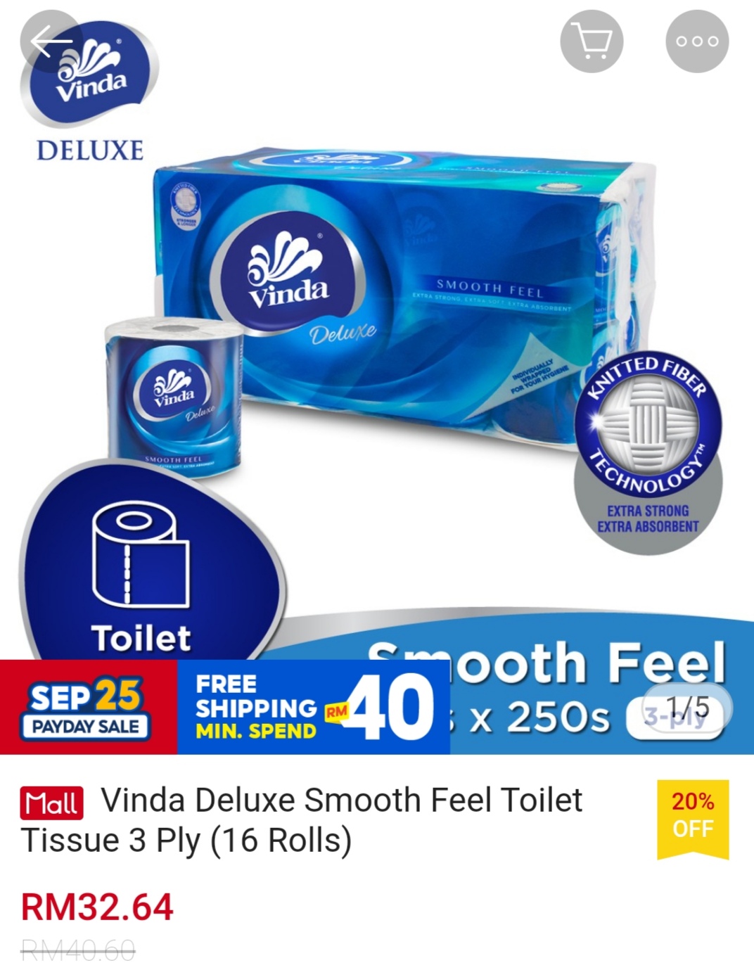 ▪ Vinda Deluxe Smooth Feel Toilet Tissue 3 Ply (16 Rolls) – RM32.64 RM25