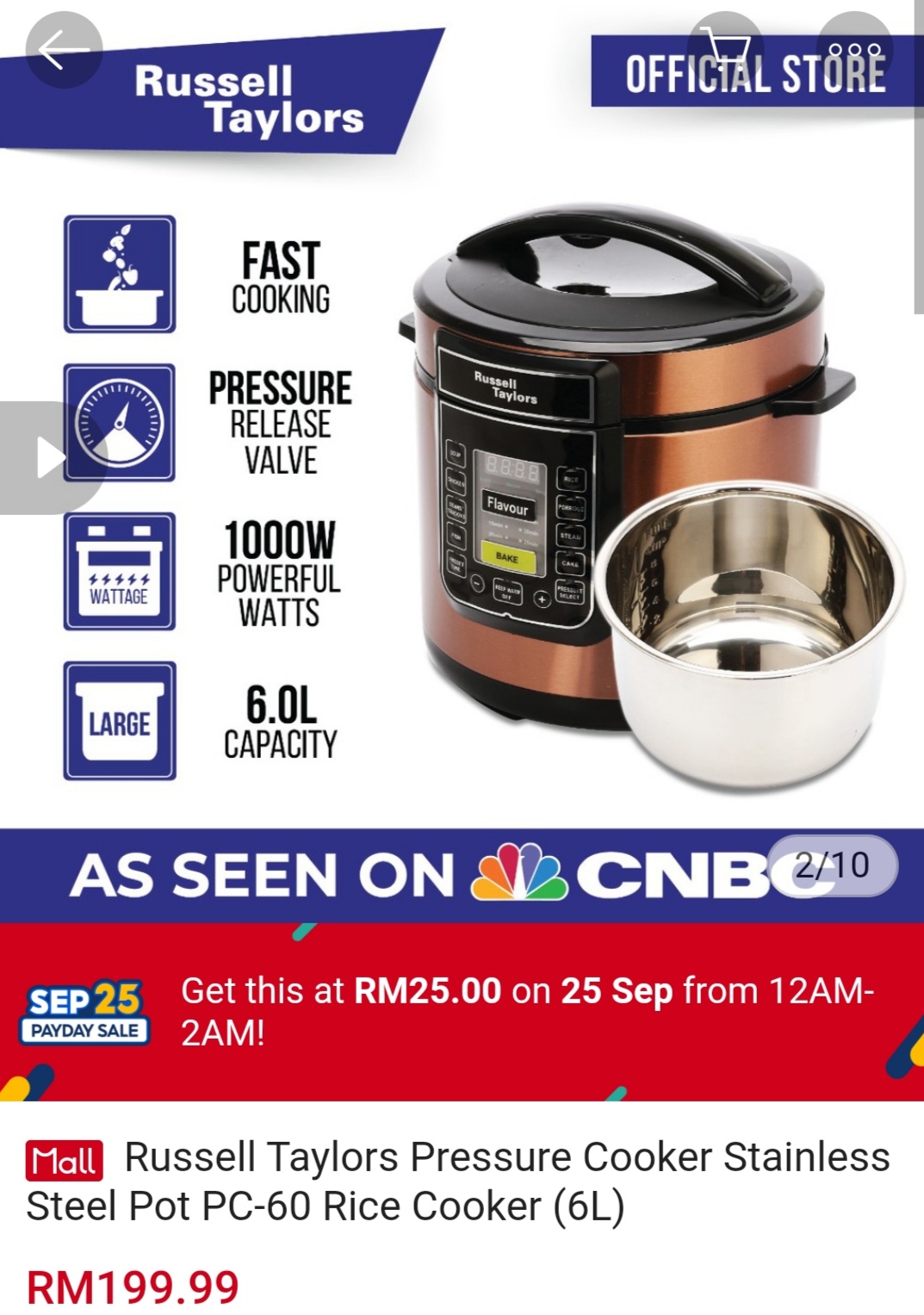 ▪ Russell Taylors Pressure Cooker Stainless Steel Pot PC-60 Rice Cooker (6L) – RM199.99 RM25