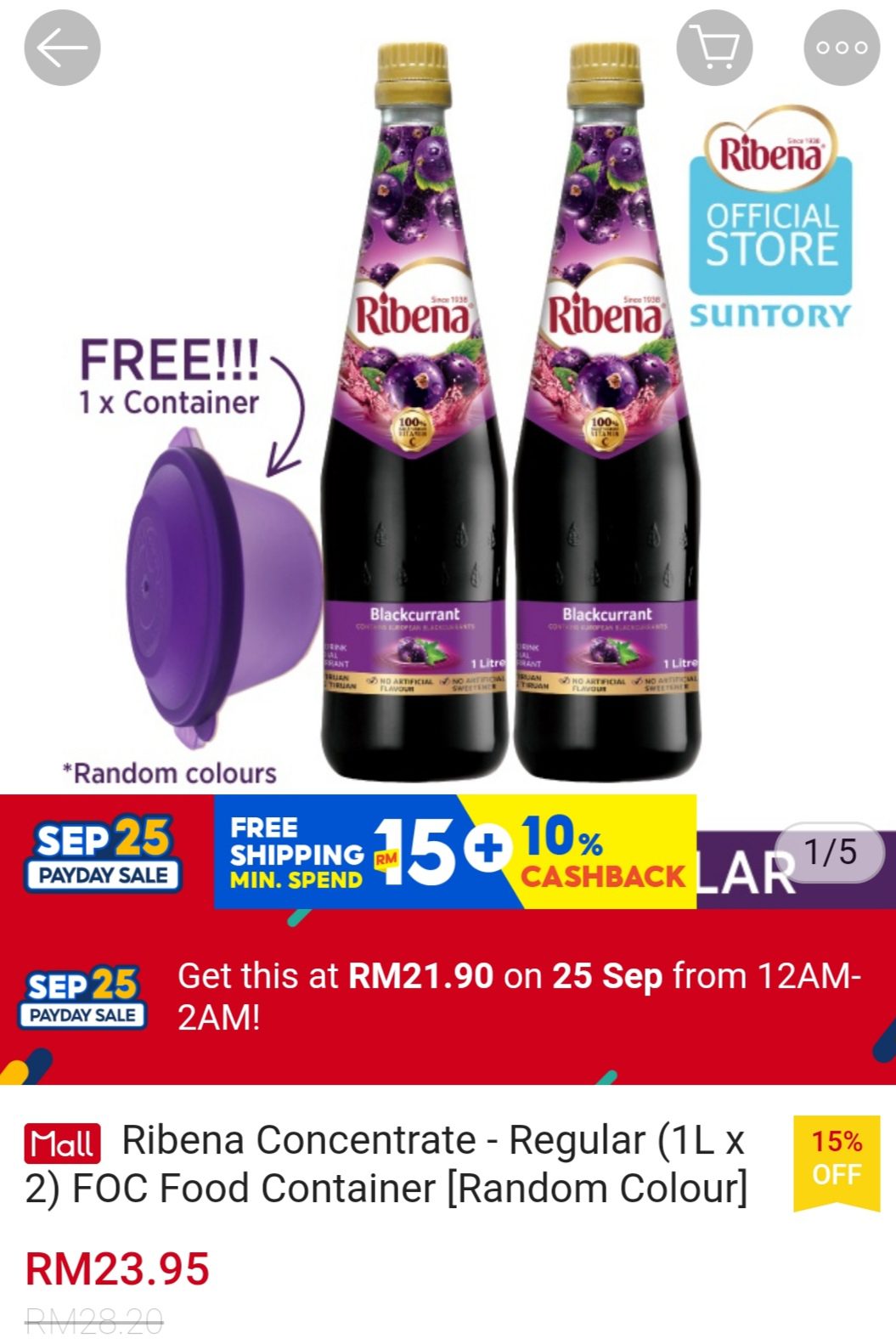 ▼ Ribena Concentrate Regular (1L x 2) FOC Food Container – RM21.90(原价RM28.20)