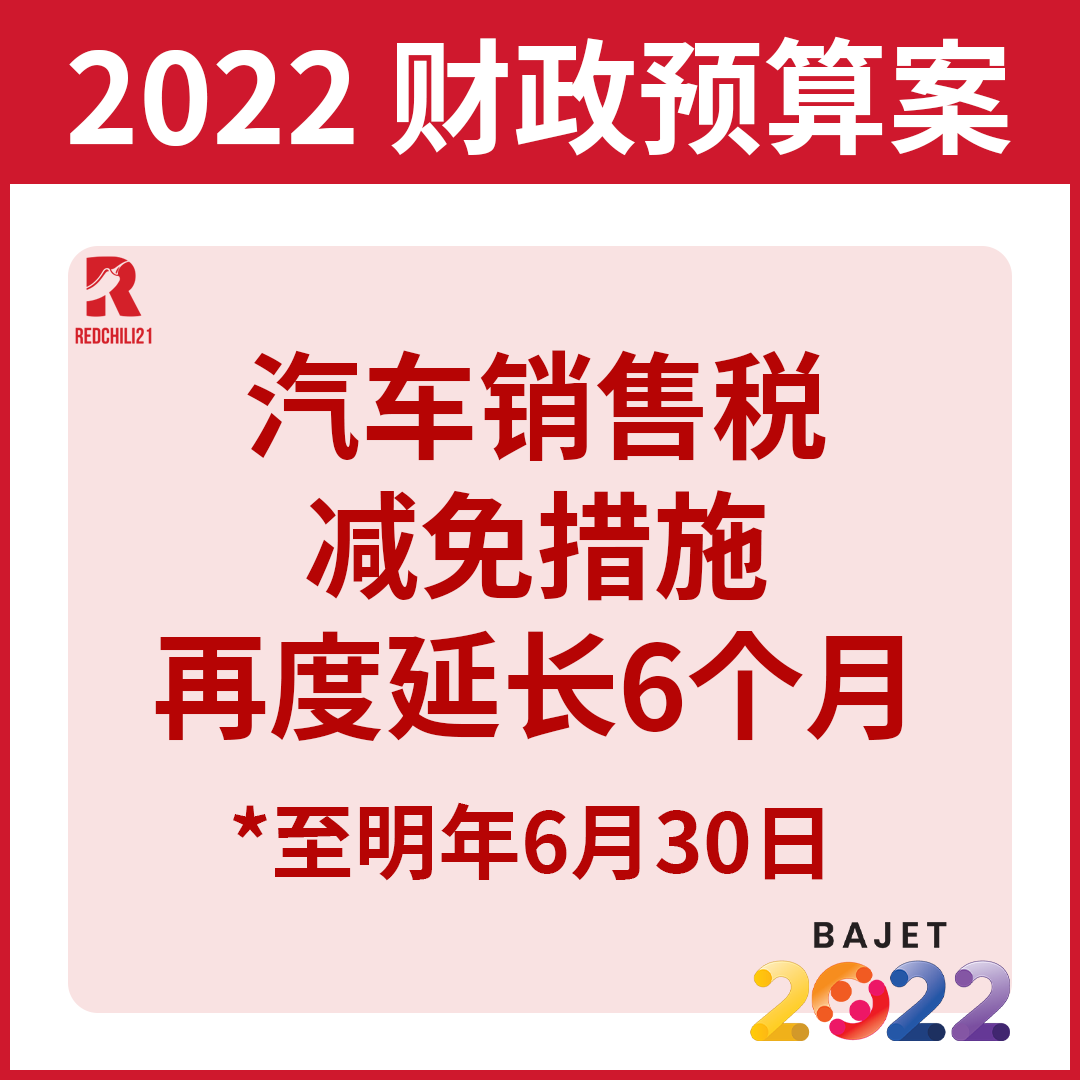 2022年马来西亚财政预算案(Belanjawan 2021)中,财政部表示:政府将会再度将汽车销售税减免计划延长半年,直到2022年6月30日。