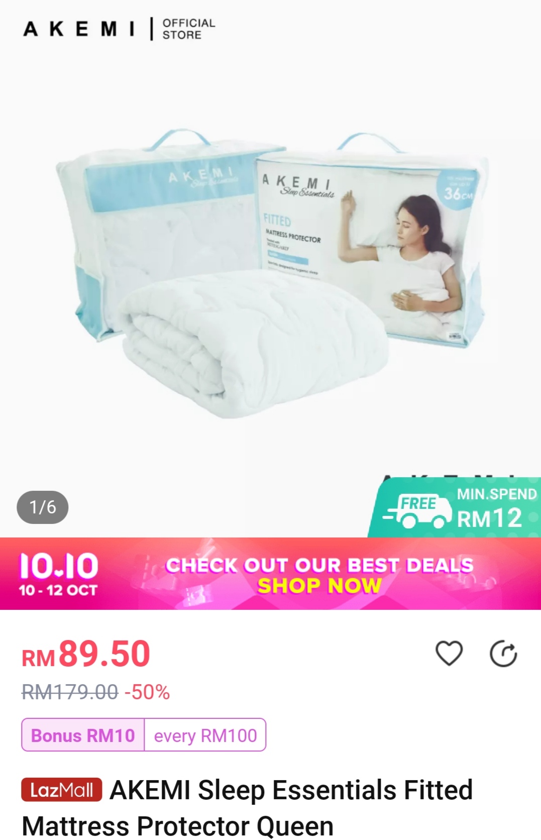 ▼ AKEMI Sleep Essentials Fitted Mattress Protector King – RM179 RM88.50